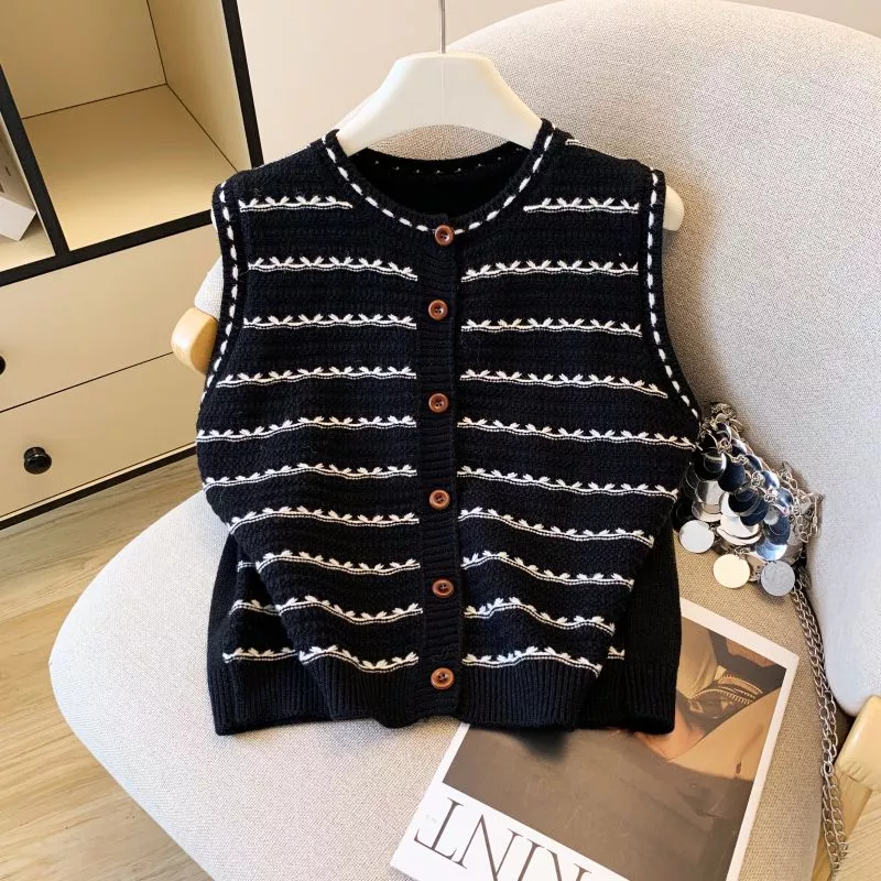 Gilet Donna Nero A Righe Elegante In Maglia Con Bottoni Girocollo CF53586