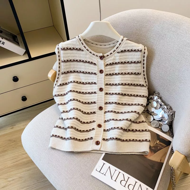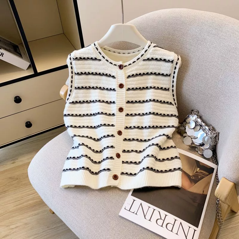 Gilet Bianco Donna In Maglia A Righe Con Bottoni Stile Elegante CF53586