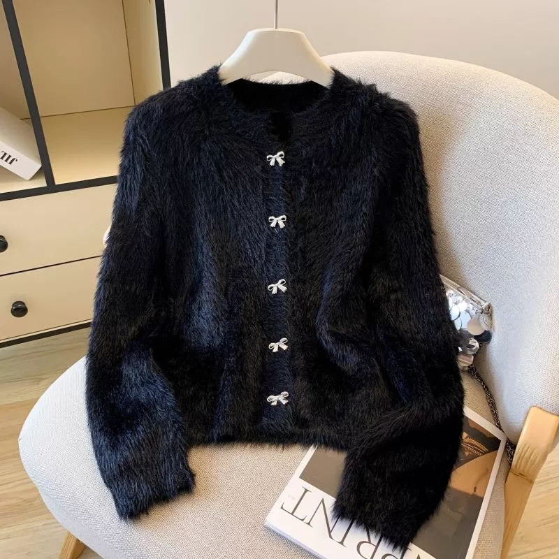 Cardigan Donna Nero Morbido Peloso Con Fiocchi Elegante Look Caldo CF58187