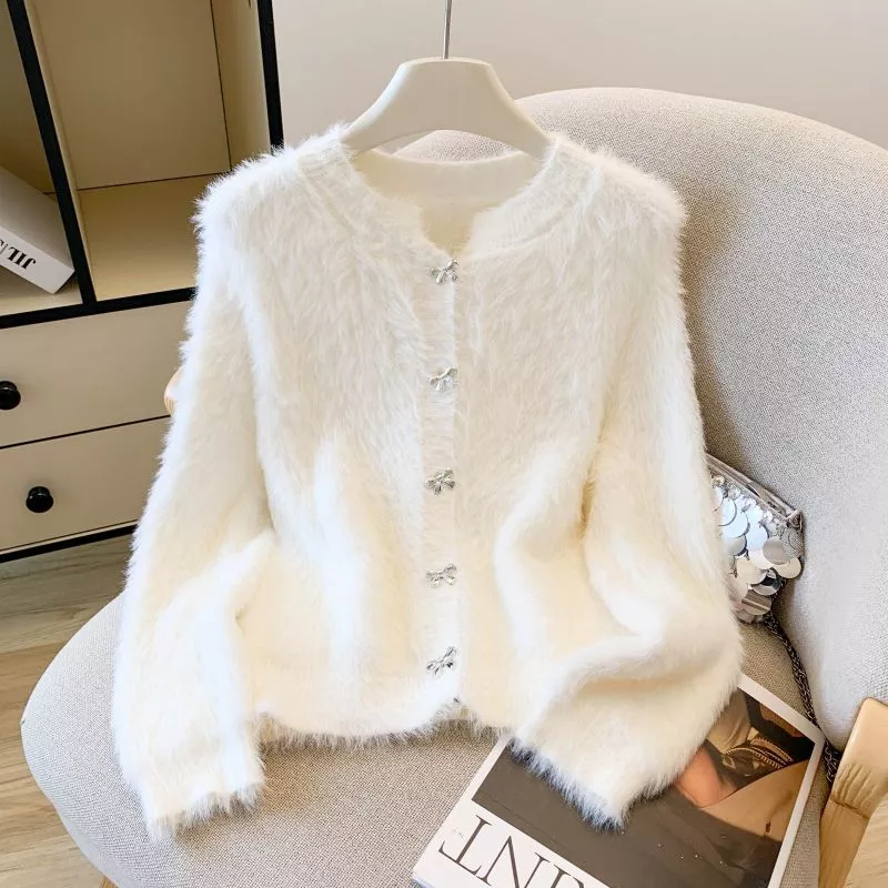 Cardigan Donna Bianco Morbido Peloso Con Fiocchi Elegante Look Caldo CF58187