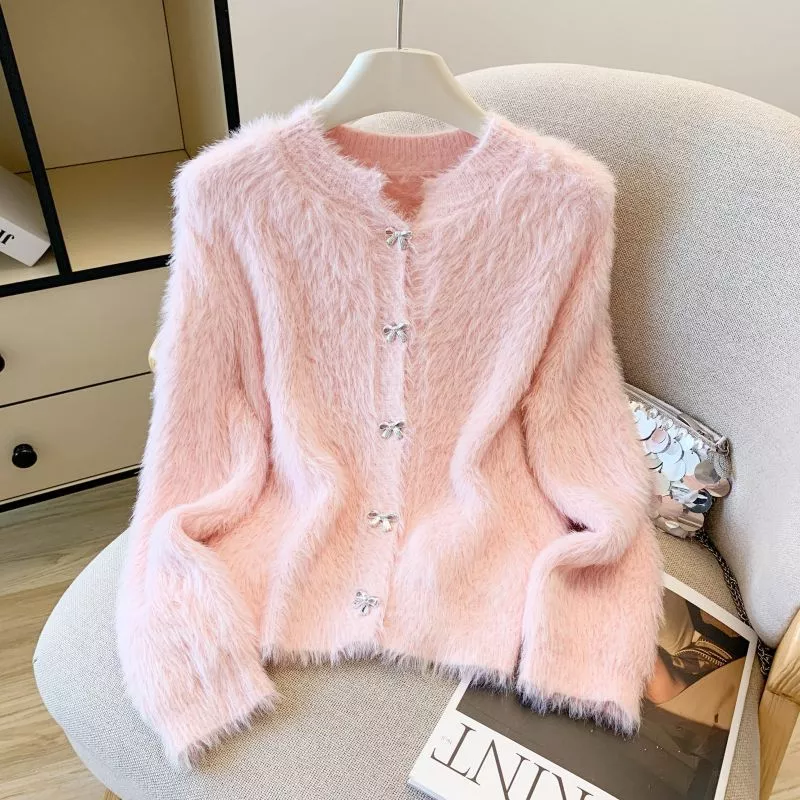 Cardigan Donna Rosa Morbido Peloso Con Fiocchi Elegante Look Caldo CF58187