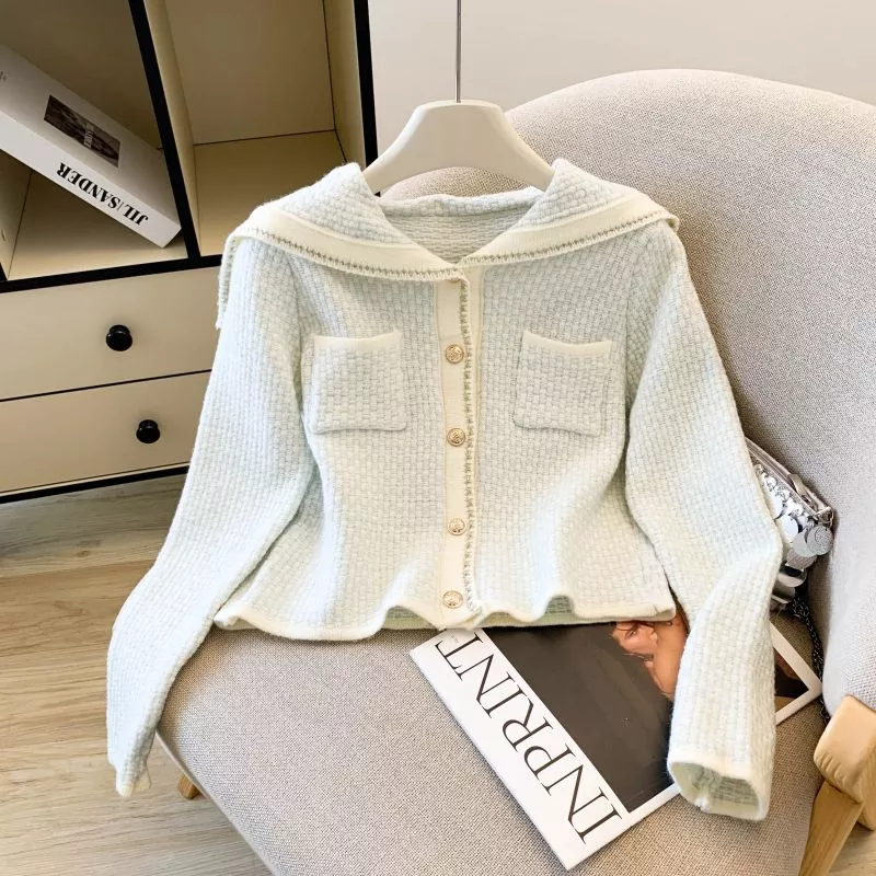 Cardigan Donna Azzurro Con Colletto Contrasto Bottoni Elegante Morbido CF58293