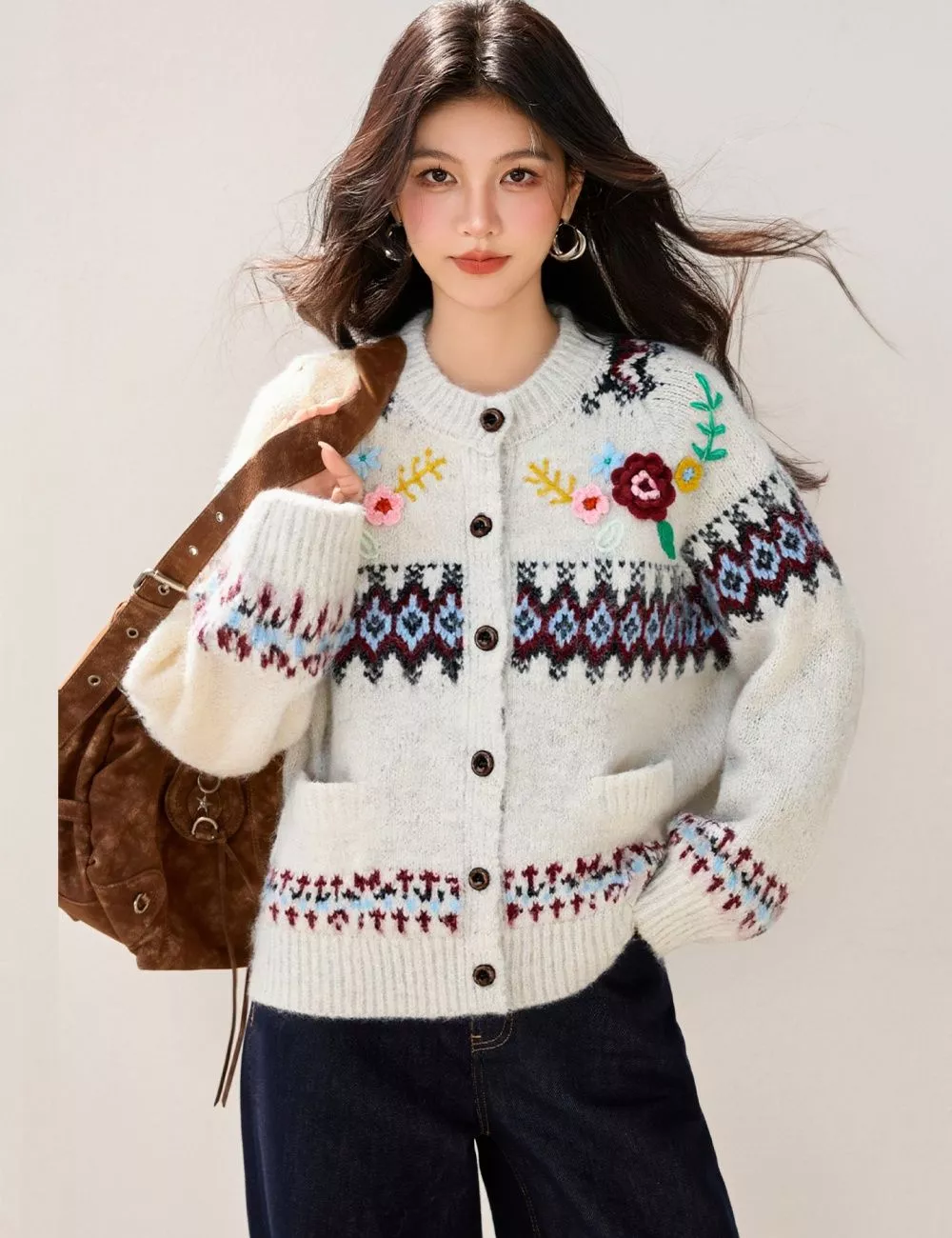 Cardigan Donna Beige Motivi Ricamati Maniche Lunghe Vestibilità Morbida CF62070