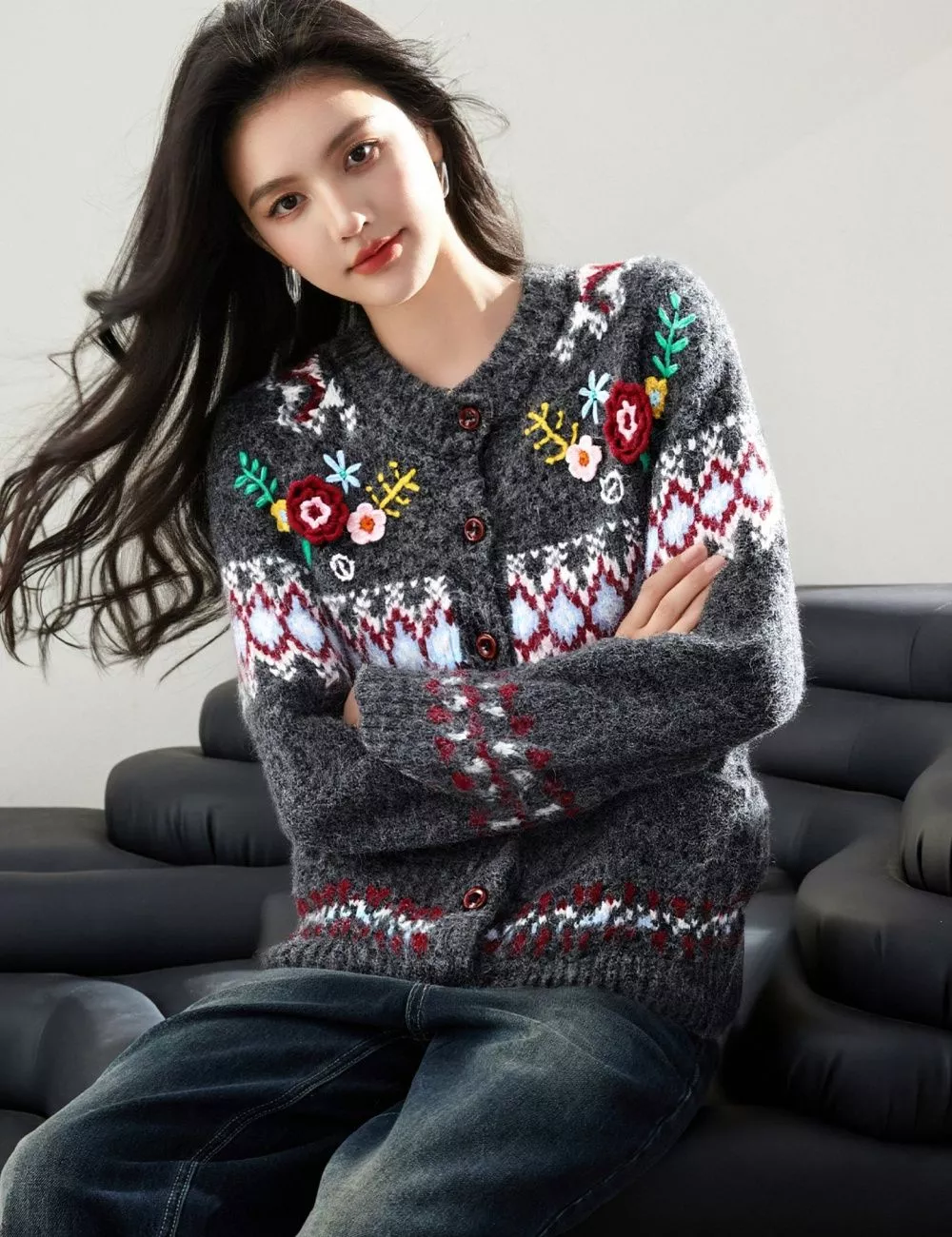 Cardigan Donna Grigio Scuro Con Motivi Ricamati Maniche Morbida CF62070