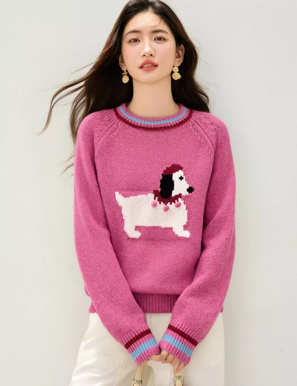 Maglione Donna Rosa Con Motivo Cane Maniche Lunghe Vestibilità Morbida CF62079