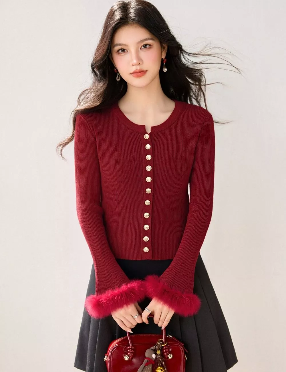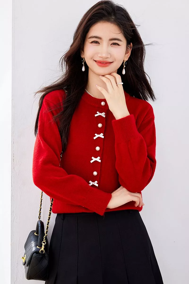 Cardigan Donna Rosso Con Bottoni Perla E Fiocchi Eleganti Maglia Fine CF62194