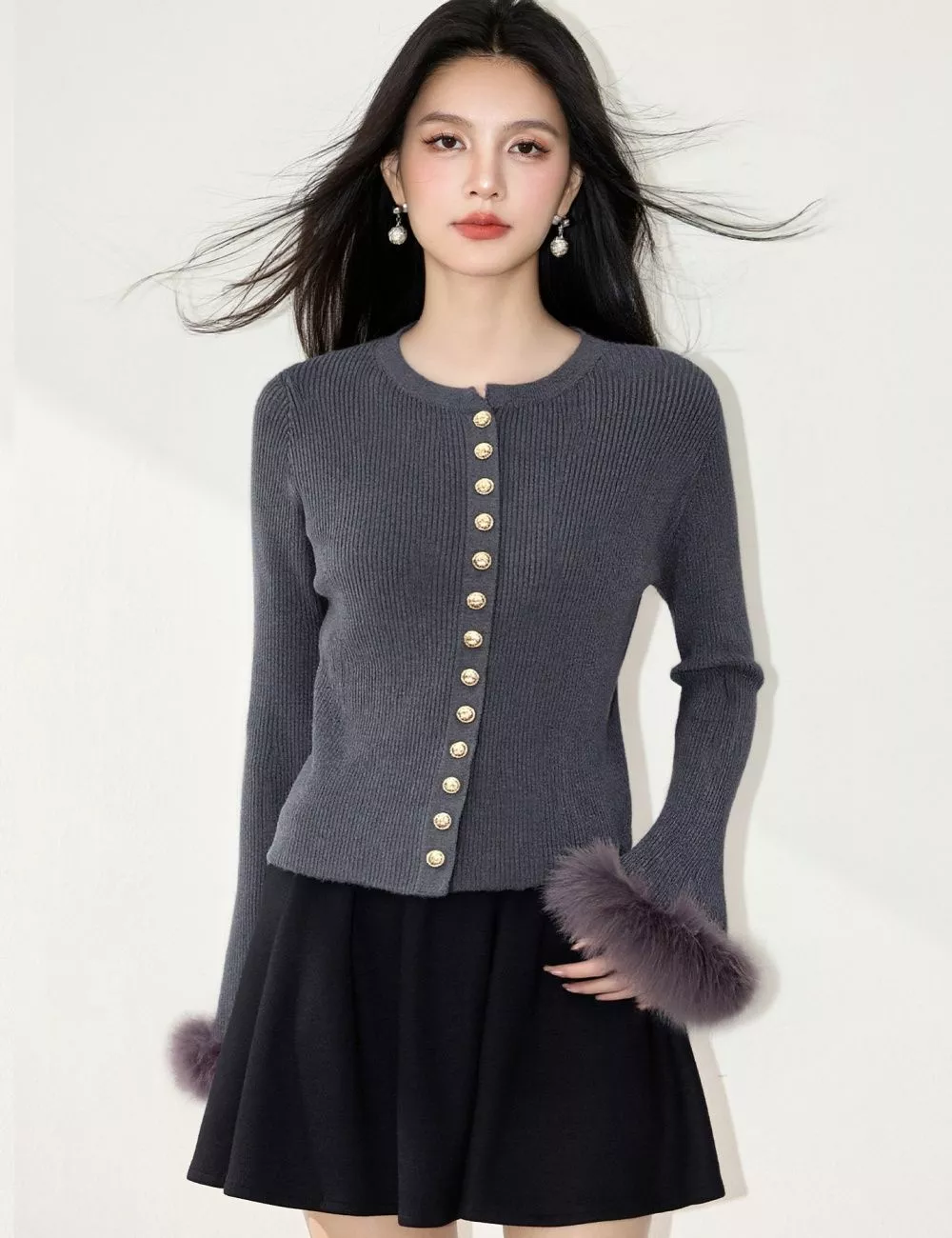 Cardigan Donna Grigio A Costine Con Bottoni Maniche Vestibilità Morbida CF62080
