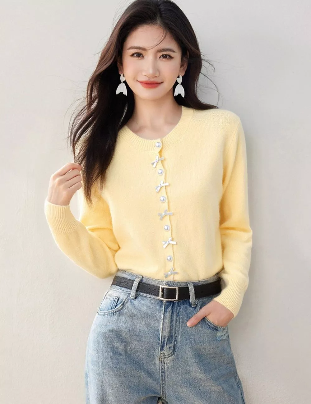 Cardigan Donna Giallo Con Bottoni Perla E Fiocchi Eleganti Maglia Fine CF62194