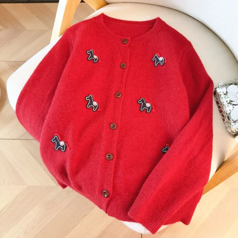 Cardigan Donna In Maglia Con Applicazioni E Chiusura Frontale Rosso CF66077