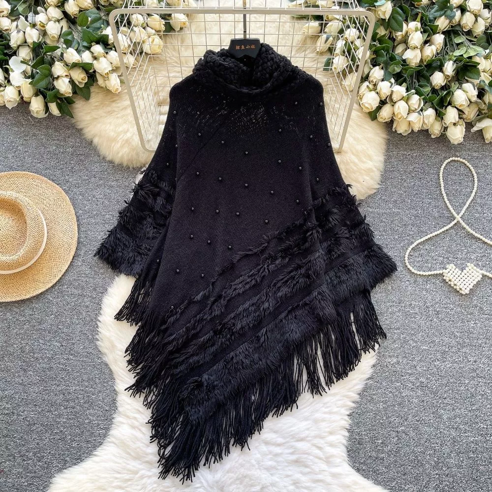 Mantella Donna Nera Con Frange E Perline Poncho Elegante Inverno CF66736