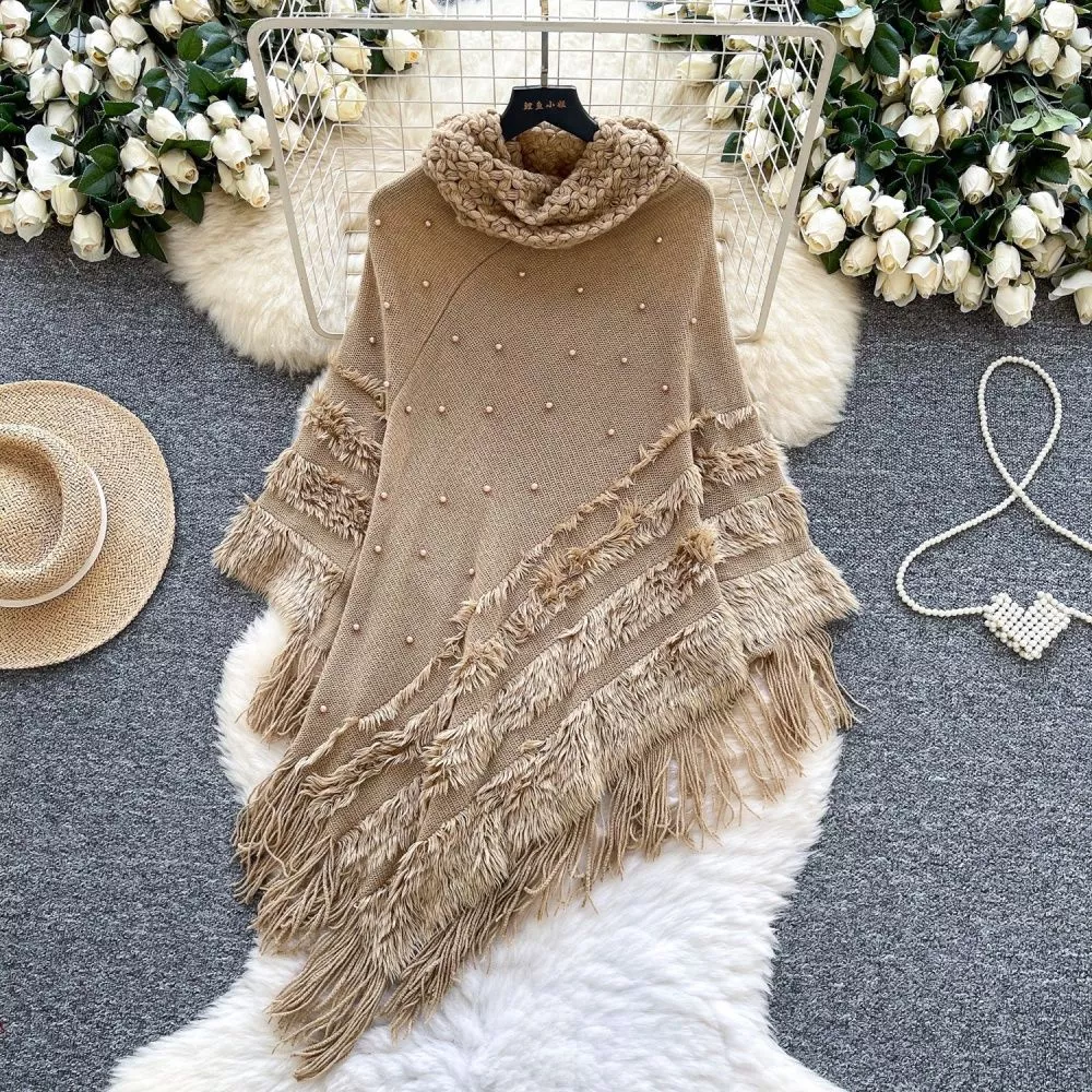 Poncho Donna Kaki Con Frange E Perline Mantella Invernale Elegante CF66736