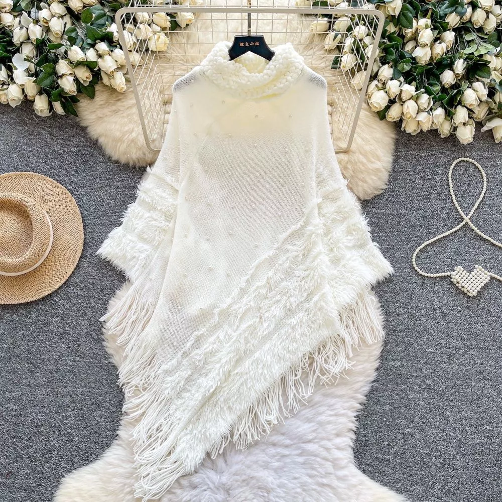 Poncho Donna Bianco Con Frange E Perline Mantella Elegante CF66736