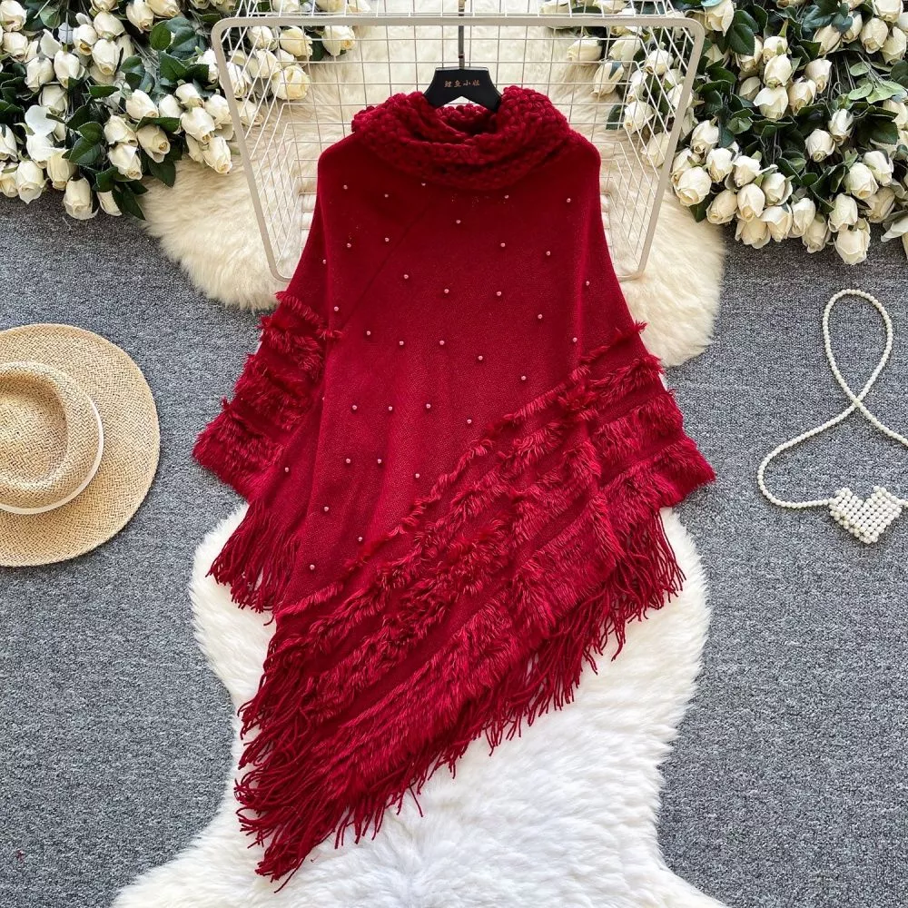 Mantella Donna Rossa Con Frange E Perline Poncho Elegante Inverno CF66736