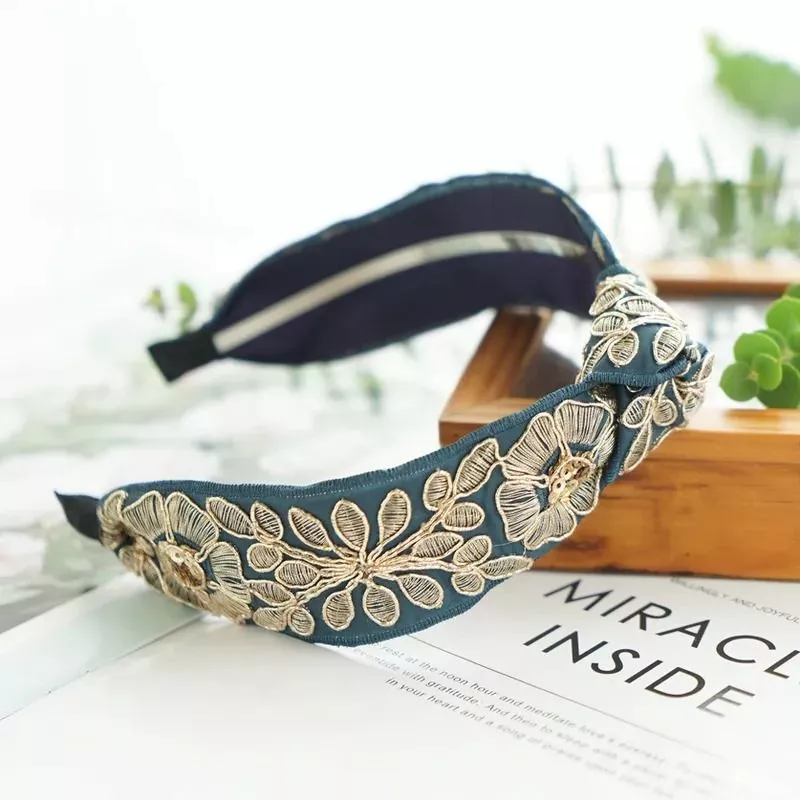 Cerchietto blu con delicato ricamo floreale dorato, perfetto per aggiungere un tocco di classe e femminilità a ogni look.