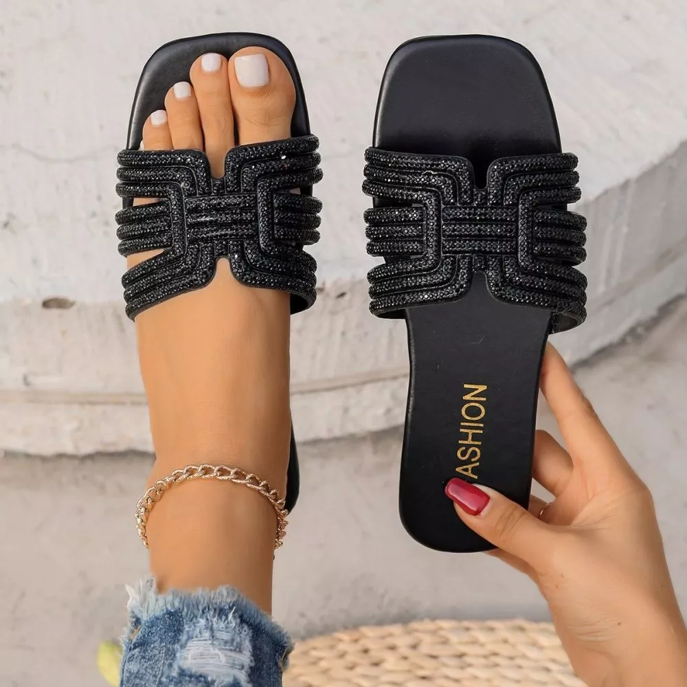 Ciabatte da donna con strass dal design elegante e moderno, ideali per la stagione estiva e per completare outfit casual con un tocco luminoso. La struttura bassa garantisce comfort durante tutta la giornata.