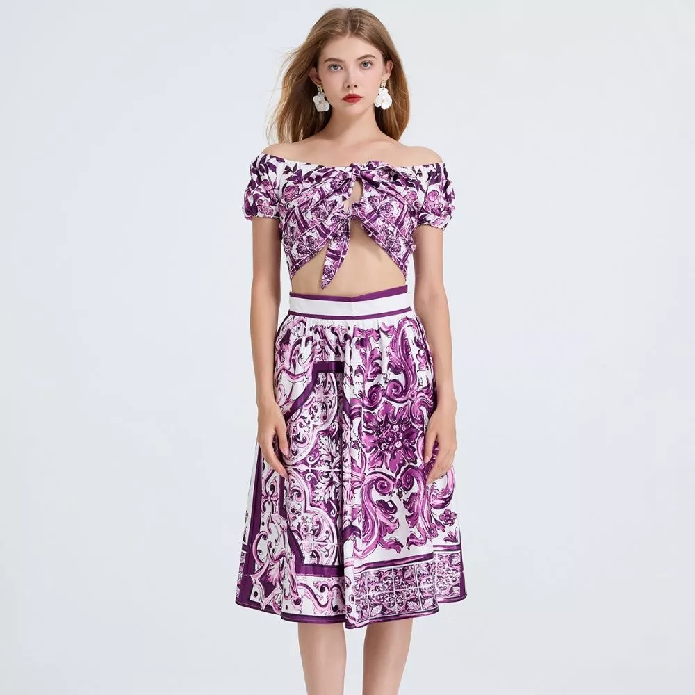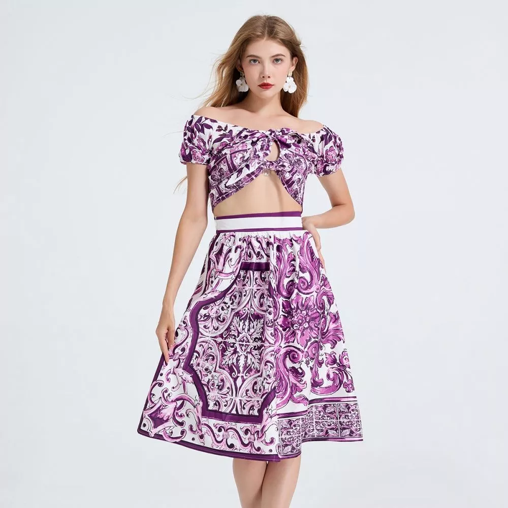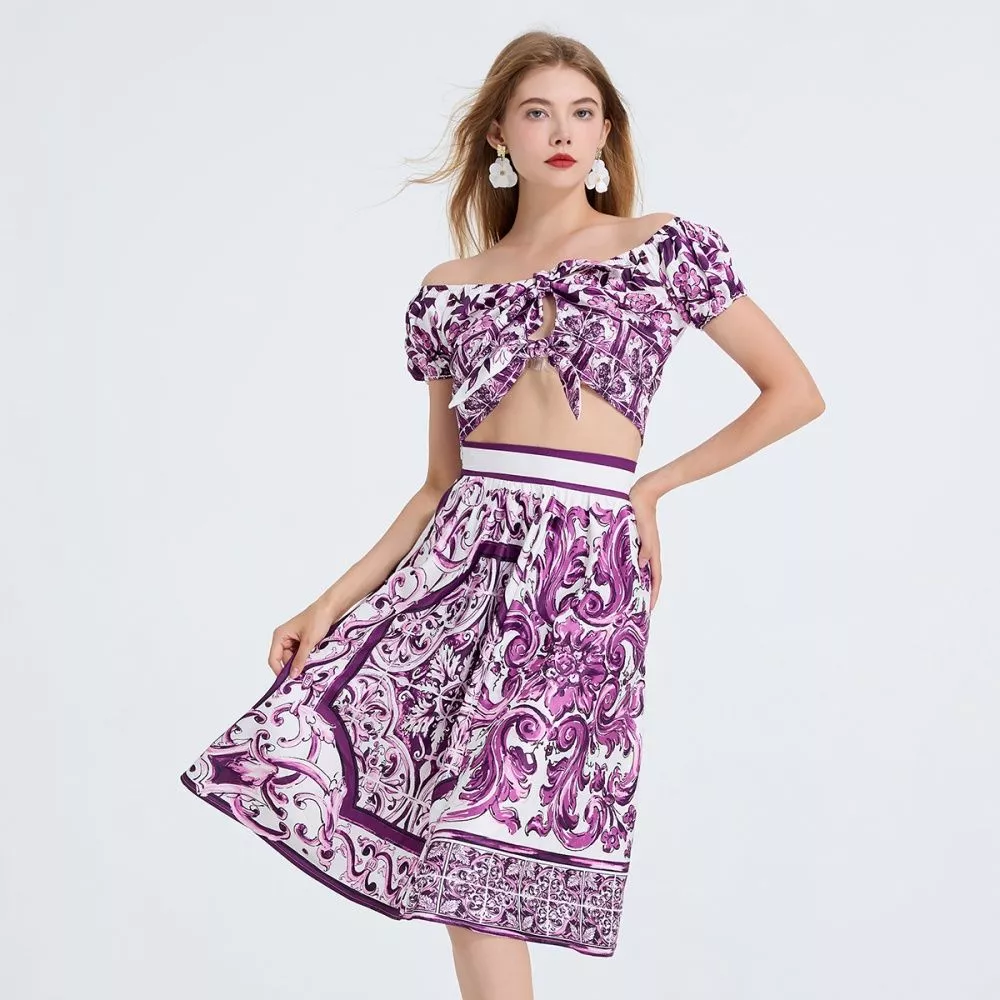 Un set 2 pezzi fresco e raffinato che unisce stile e femminilità. Il top corto con nodo frontale e spalle scoperte esalta la silhouette con un tocco sensuale, mentre la gonna midi a fantasia porpora aggiunge movimento e carattere all’outfit. Un completo versatile, ideale per serate estive, feste, vacanze o eventi chic, perfetto per chi vuole distinguersi con un look coordinato e moderno.