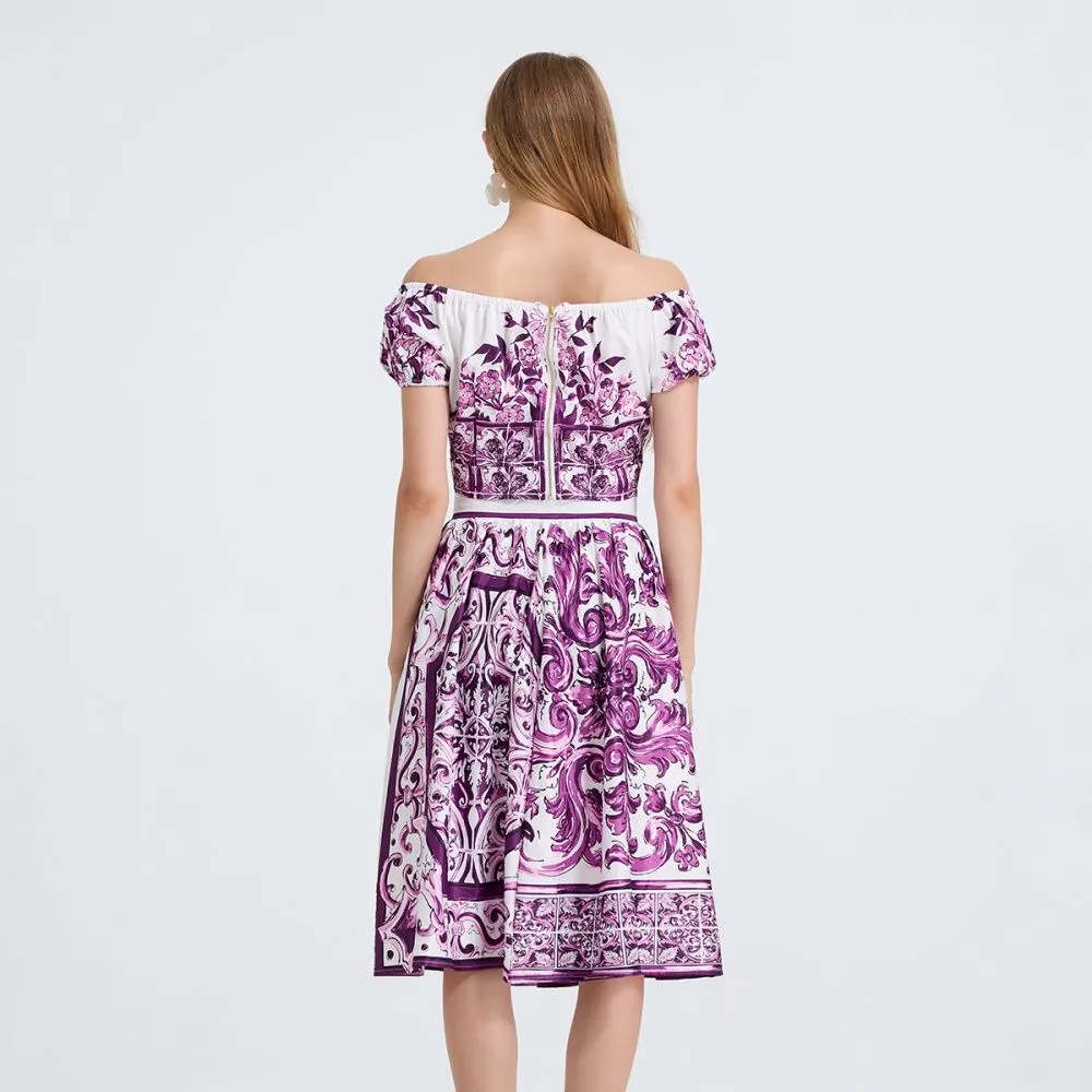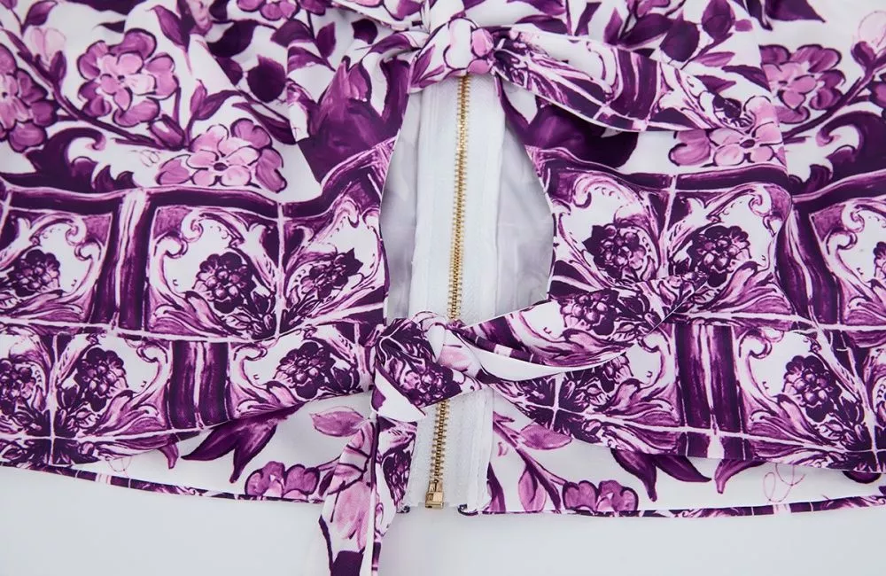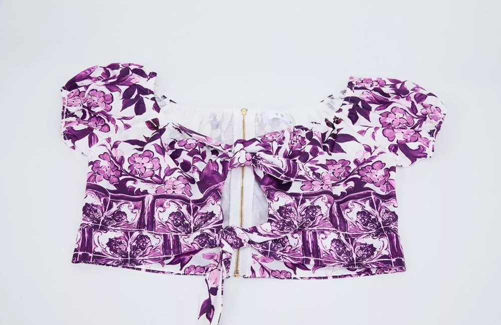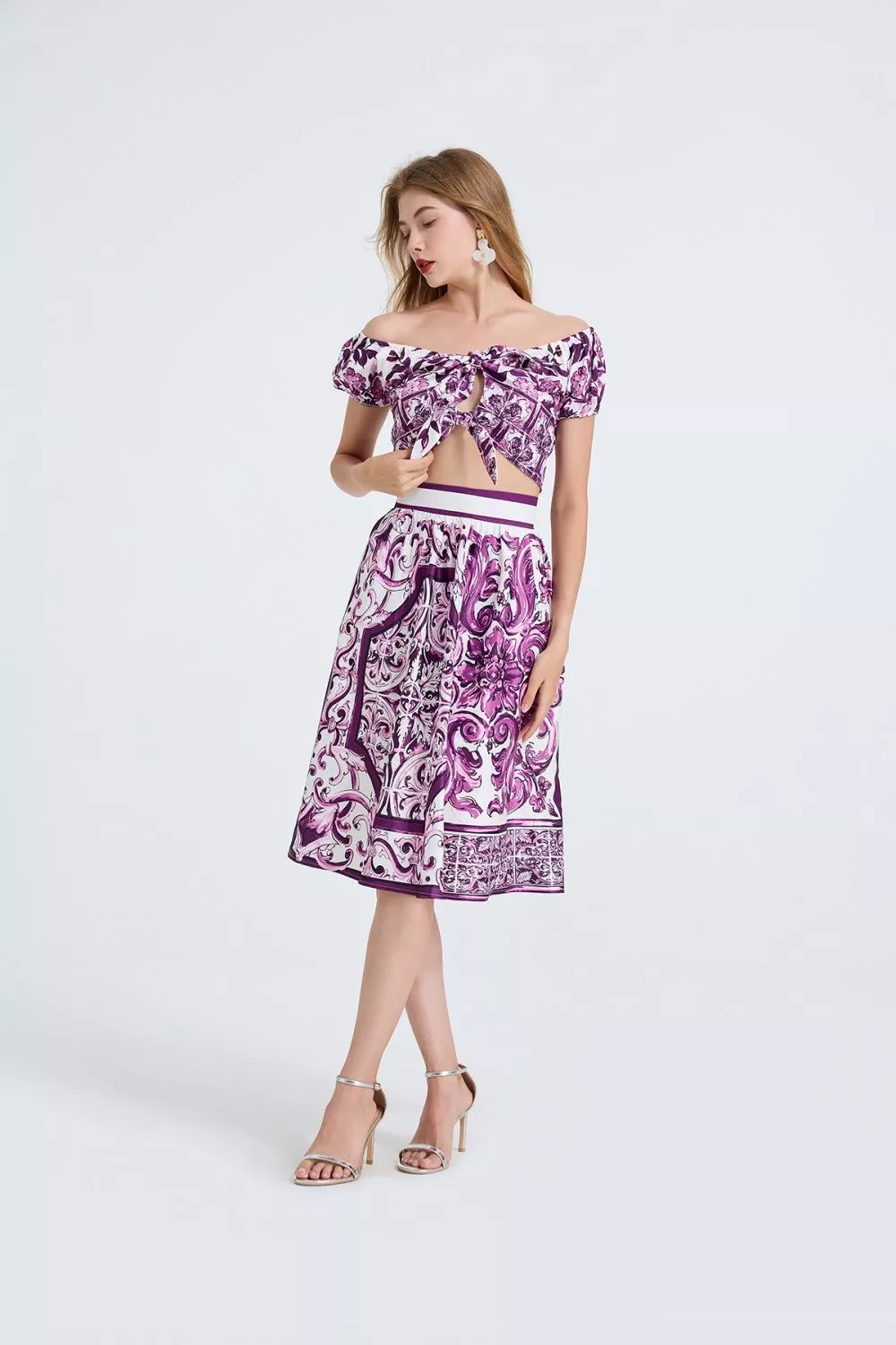 Un set 2 pezzi fresco e raffinato che unisce stile e femminilità. Il top corto con nodo frontale e spalle scoperte esalta la silhouette con un tocco sensuale, mentre la gonna midi a fantasia porpora aggiunge movimento e carattere all’outfit. Un completo versatile, ideale per serate estive, feste, vacanze o eventi chic, perfetto per chi vuole distinguersi con un look coordinato e moderno.