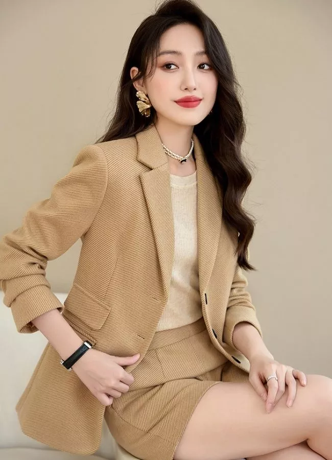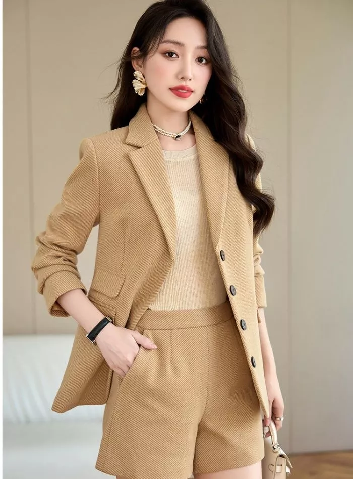 Completo Donna Beige Giacca Elegante E Shorts Coordinati Raffinati CF58279