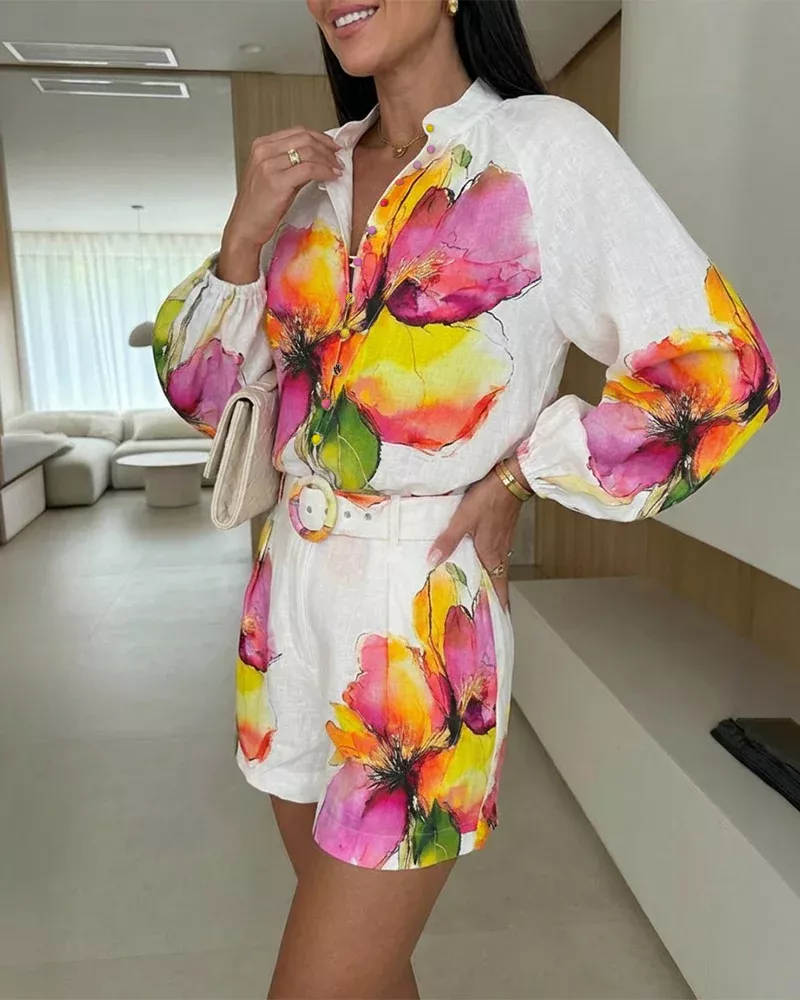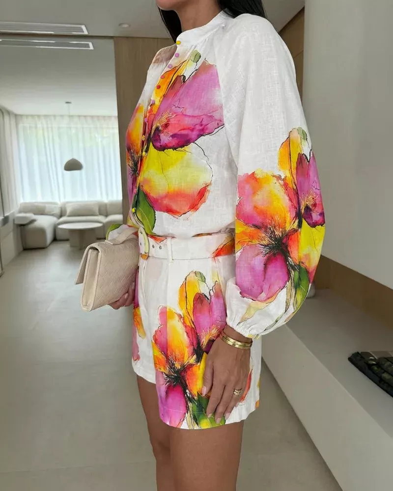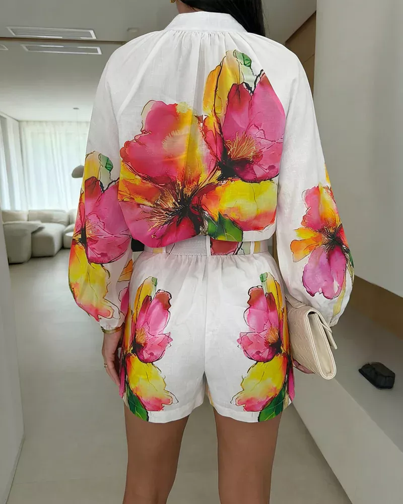 Completo donna dal design fresco e luminoso, caratterizzato da una base bianca impreziosita da una stampa floreale dai colori vivaci. La camicia con linea morbida e taglio leggero crea un effetto raffinato ma disinvolto, mentre il pantaloncino coordinato valorizza la silhouette con equilibrio e naturalezza.