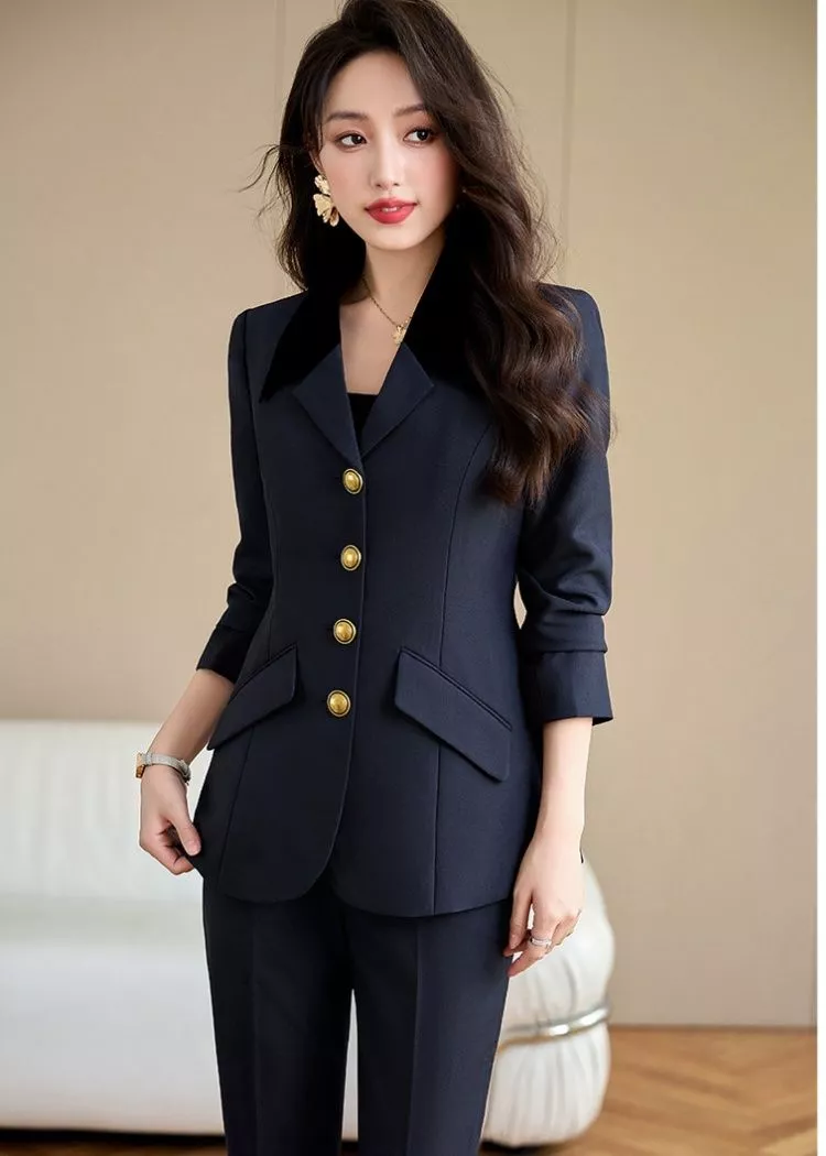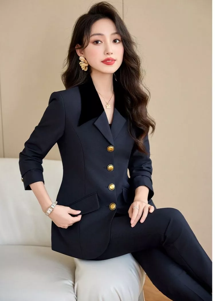 Questo completo donna, composto da giacca strutturata e pantaloni eleganti, è pensato per valorizzare la figura con una linea affusolata e moderna. La giacca presenta un taglio sartoriale con bottoni decorativi dorati e collo nero a contrasto, un dettaglio che rende l'insieme ancora più raffinato. I pantaloni, dritti e slanciati, completano un look ideale per l'ufficio, per gli appuntamenti professionali o per chi desidera uno stile curato e femminile in ogni occasione.