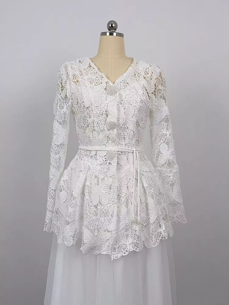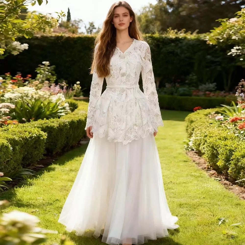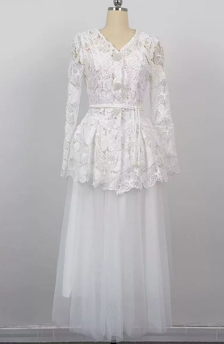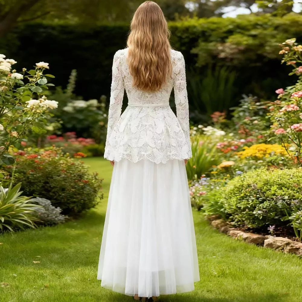 Completo elegante da donna composto da tre pezzi coordinati: top interno, camicia in pizzo avorio e gonna lunga in tulle leggero. La camicia presenta un pizzo ricco e raffinato con cintura sottile che definisce la vita e dona armonia alla silhouette. La gonna lunga crea movimento fluido e un effetto etereo, perfetto per eventi, cerimonie, shooting o occasioni speciali.