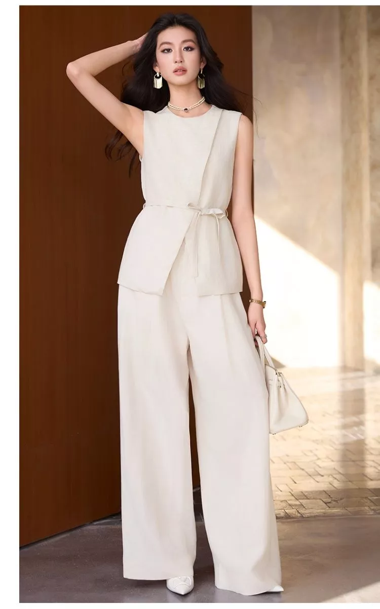 Completo elegante composto da gilet smanicato con cintura e pantalone ampio coordinato. Un outfit moderno e raffinato ideale per ufficio, lavoro, eventi di giorno e occasioni eleganti. La linea fluida e la cintura in vita valorizzano la silhouette creando un look sofisticato e contemporaneo.