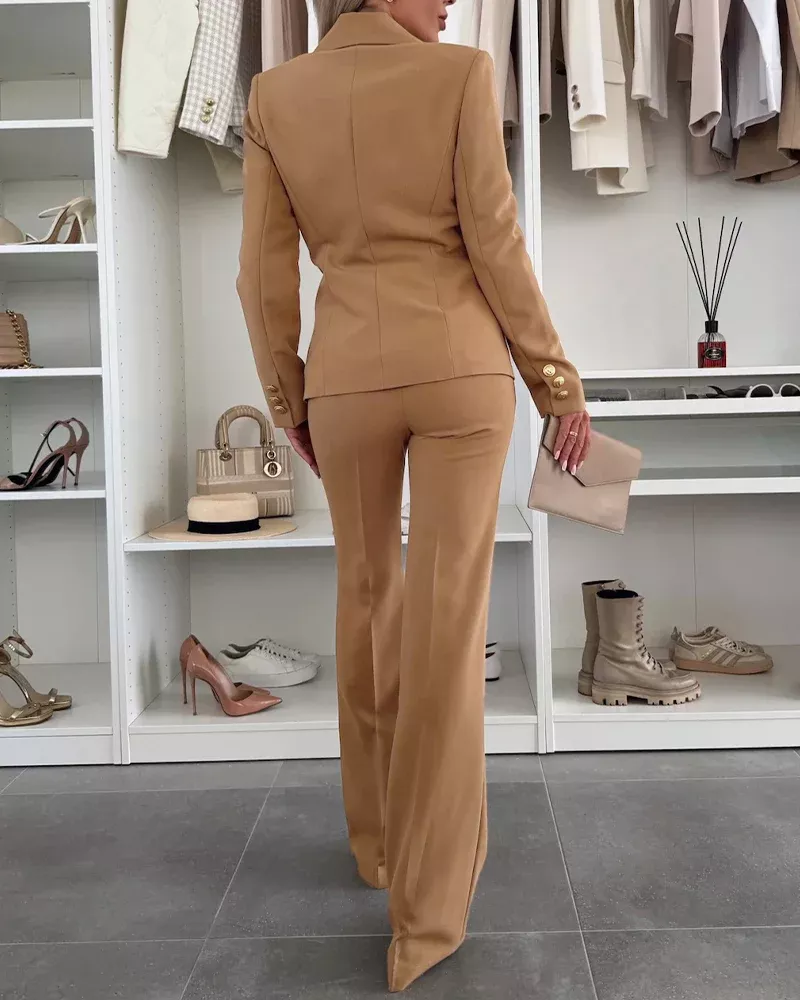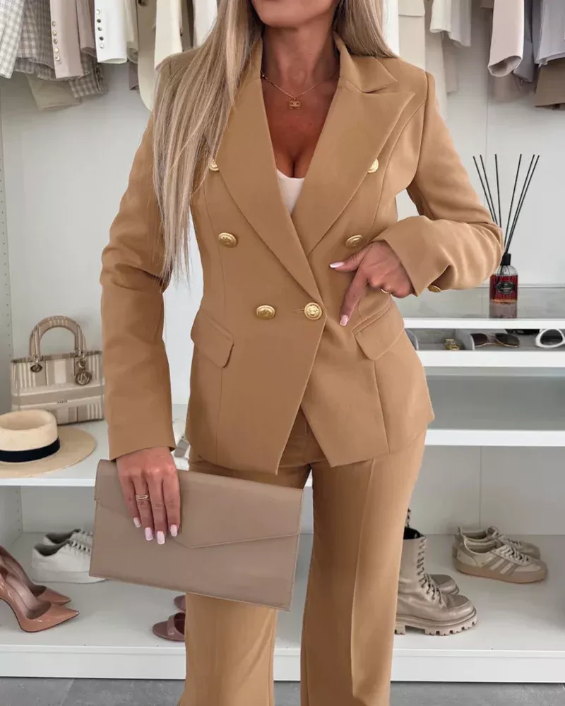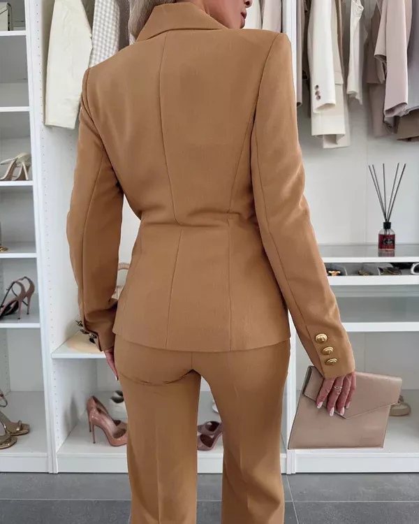 Completo donna elegante composto da blazer doppiopetto e pantalone a palazzo, progettato per valorizzare la silhouette con un equilibrio preciso tra struttura e fluidità. Il taglio sartoriale del blazer definisce le spalle e il punto vita, creando una linea pulita e slanciata che trasmette sicurezza e presenza.