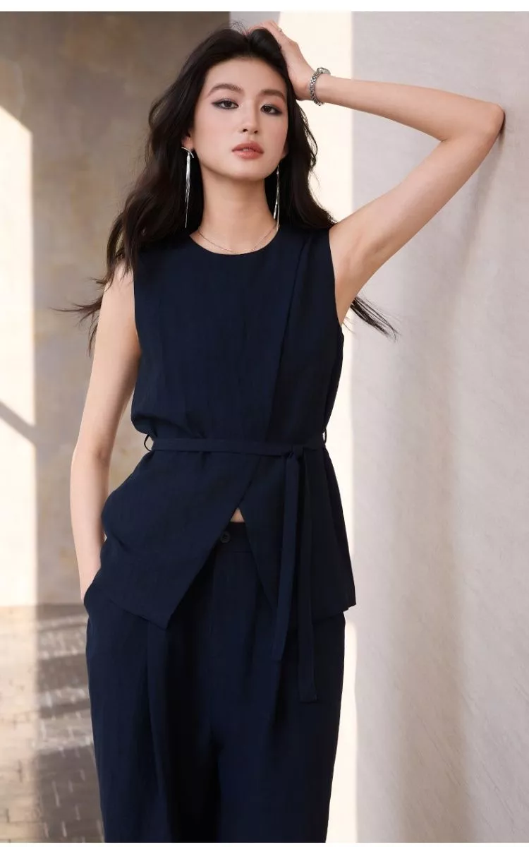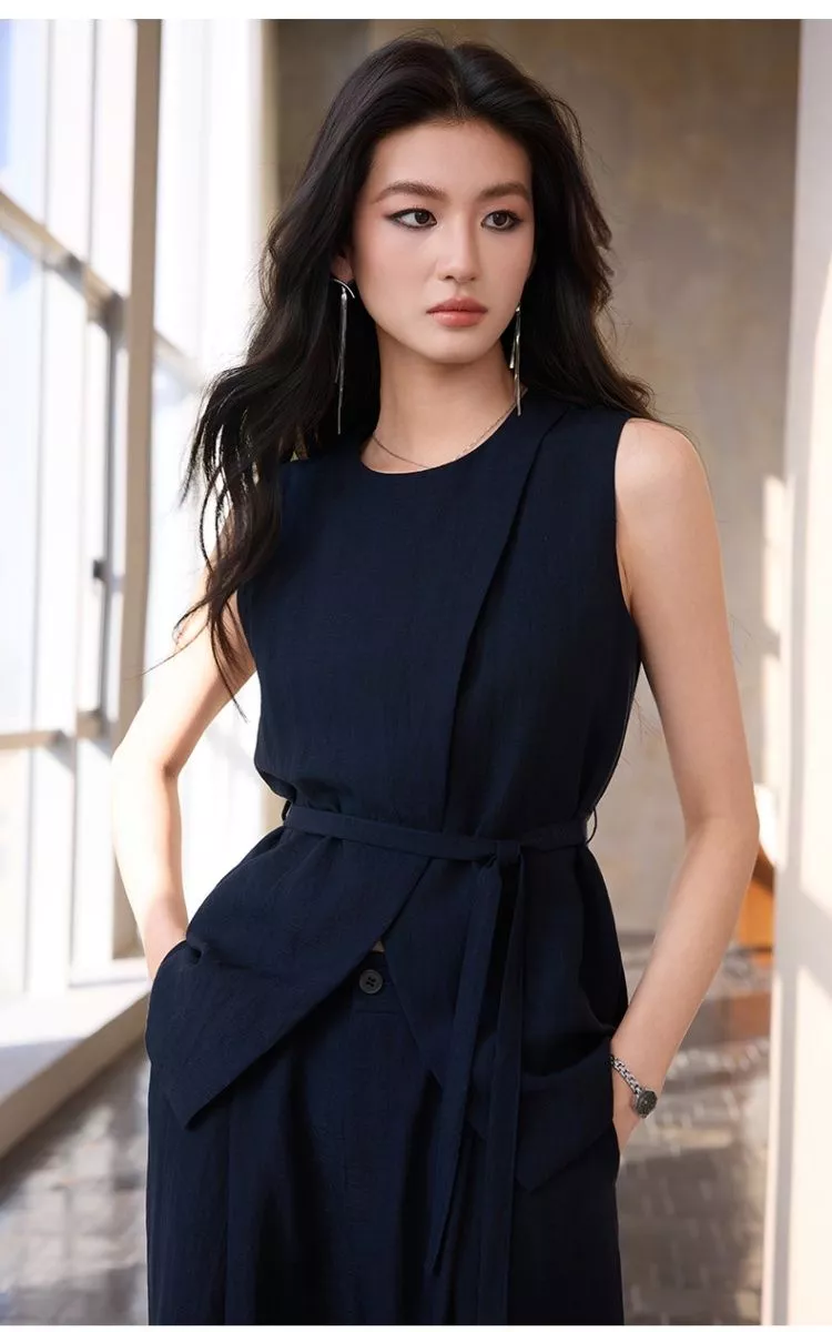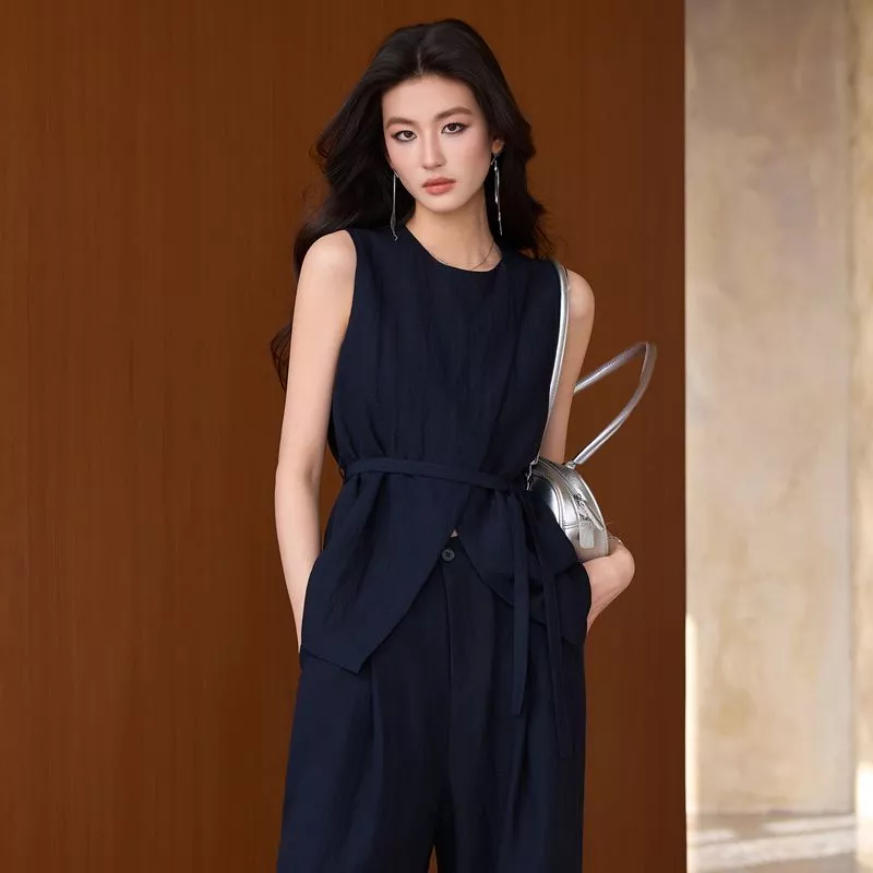 Completo elegante composto da gilet smanicato con cintura e pantalone ampio coordinato. Un outfit moderno e raffinato ideale per ufficio, lavoro, eventi di giorno e occasioni eleganti. La linea fluida e la cintura in vita valorizzano la silhouette creando un look sofisticato e contemporaneo.