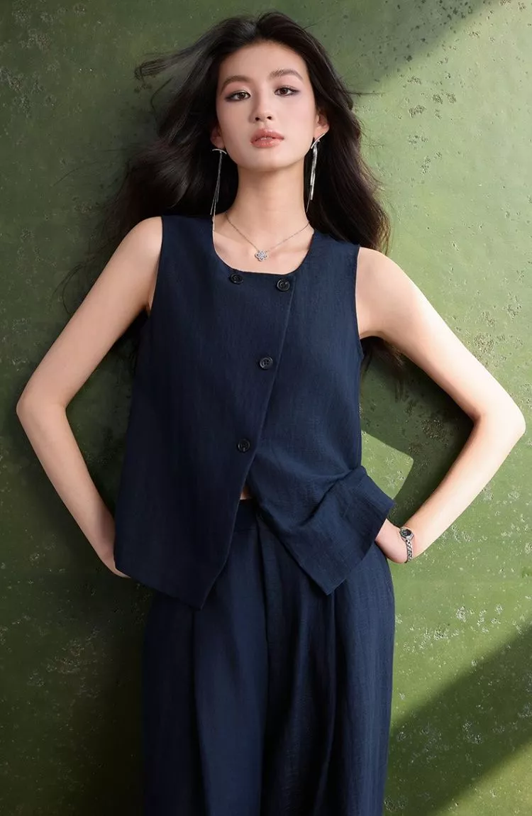 Completo elegante composto da gilet smanicato con bottoni frontali e pantalone ampio palazzo coordinato. Un outfit raffinato e moderno perfetto per ufficio, lavoro, eventi di giorno e occasioni eleganti. La linea fluida e minimal crea un look sofisticato e versatile ideale per chi cerca un completo femminile chic e contemporaneo.