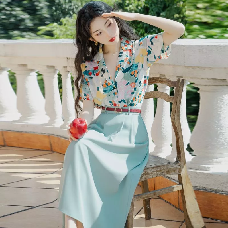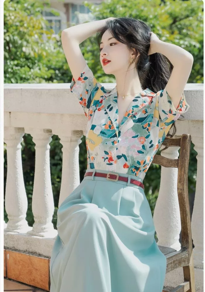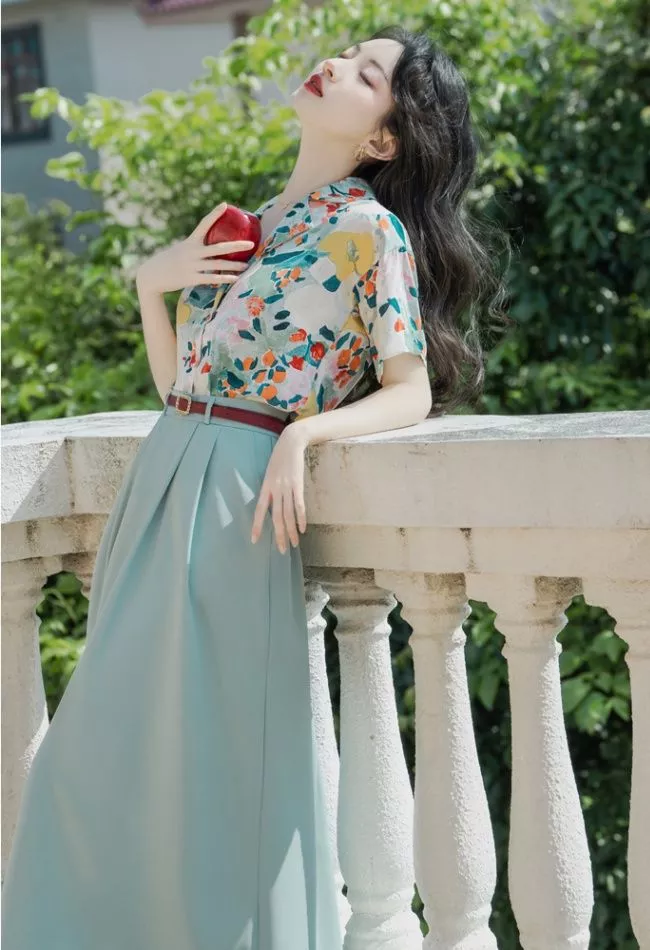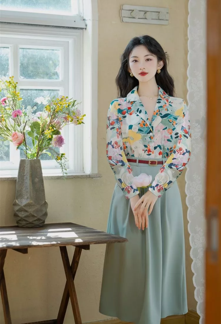 Completo donna elegante composto da camicia floreale e gonna lunga a vita alta, perfetto per un look raffinato e femminile. La camicia con colletto classico e stampa floreale multicolor dona freschezza e carattere, mentre la gonna lunga verde salvia crea un contrasto armonioso e sofisticato.