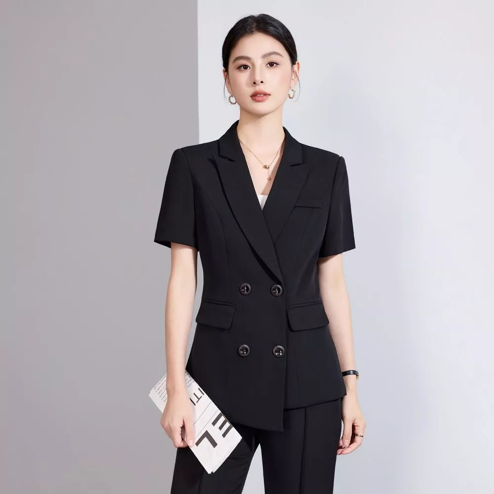 Completo donna dal taglio sartoriale composto da blazer doppiopetto a manica corta e pantaloni a gamba ampia dal taglio palazzo. Un outfit raffinato e contemporaneo pensato per valorizzare la silhouette con una linea pulita e strutturata.