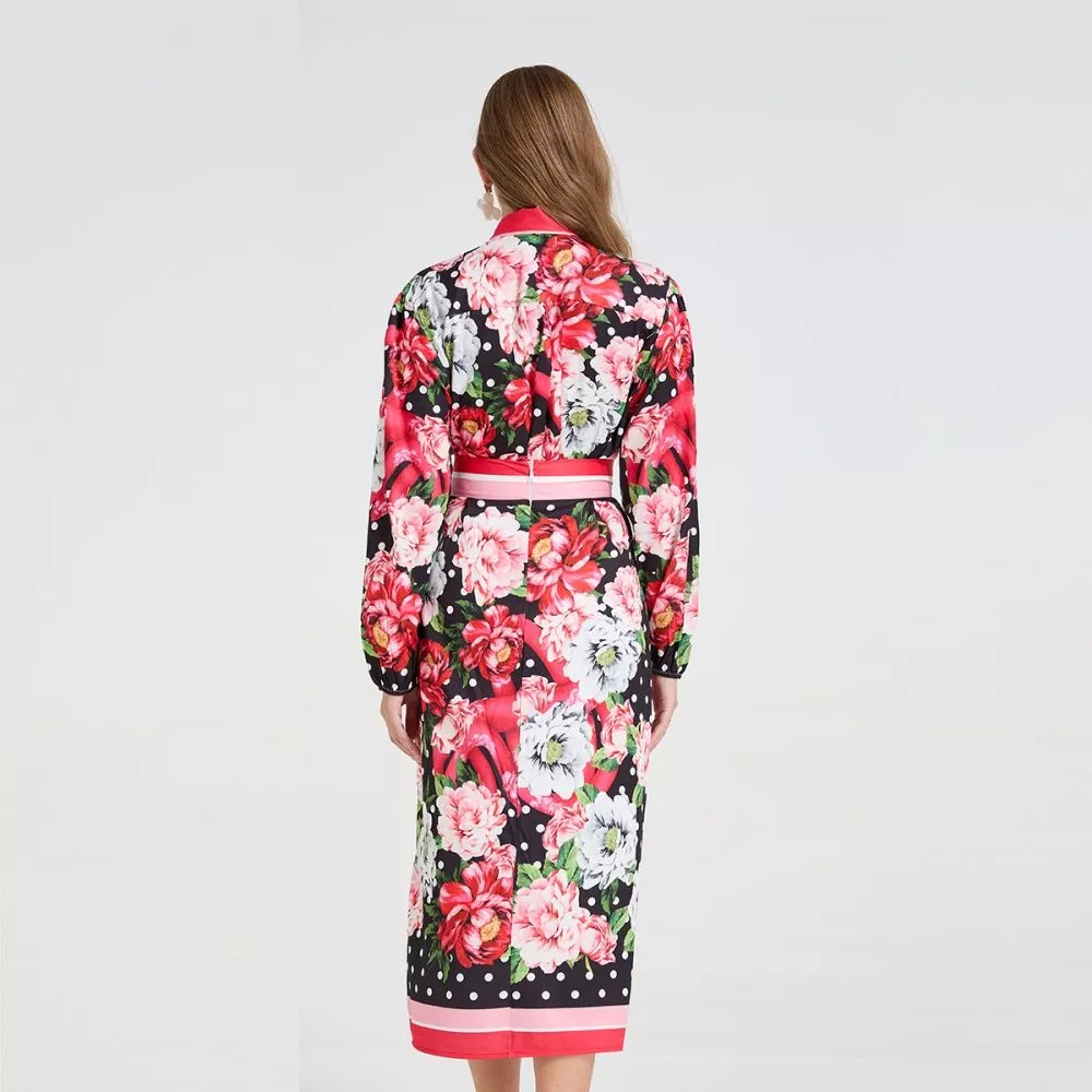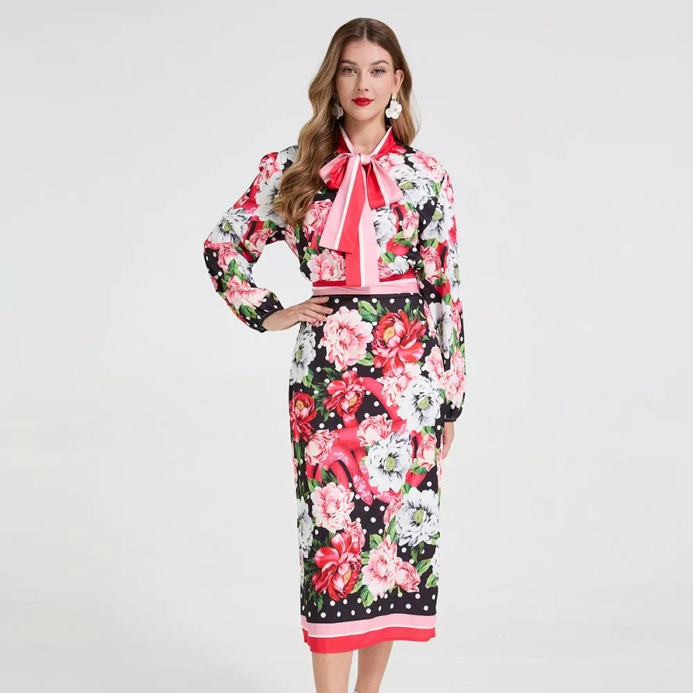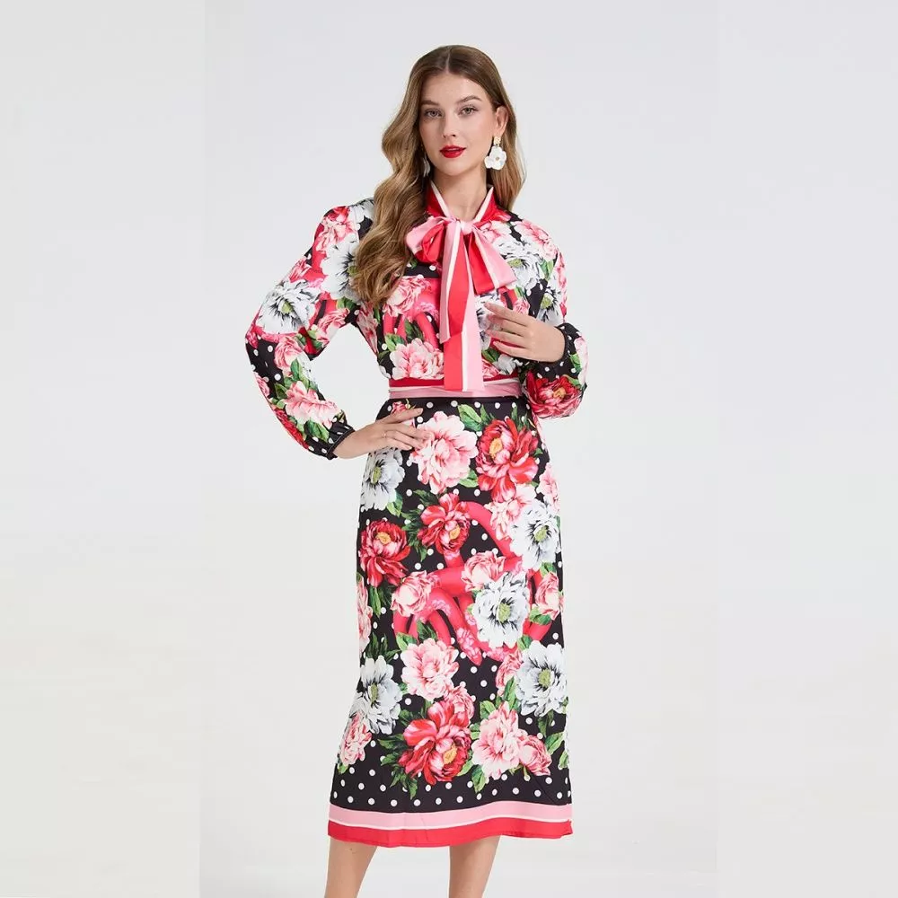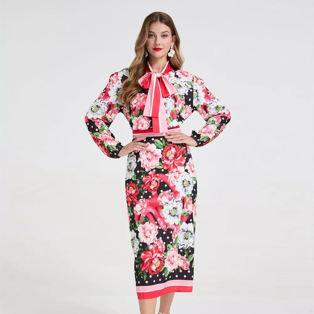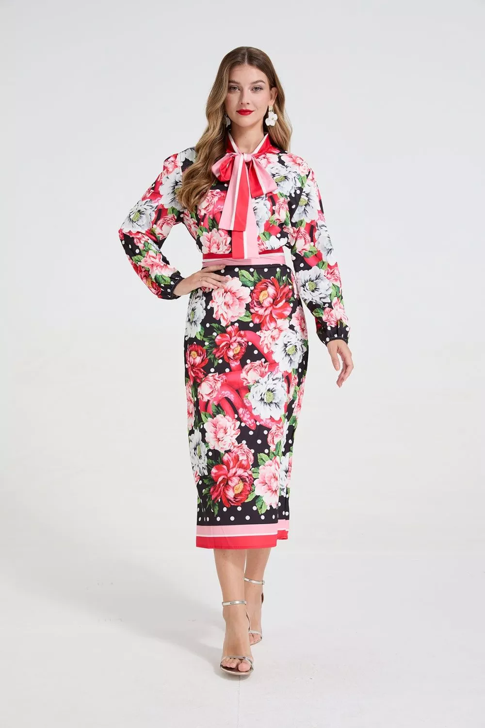 Completo donna elegante composto da camicia a maniche lunghe con fiocco frontale e gonna midi coordinata. La fantasia floreale su fondo scuro crea un effetto luminoso e femminile, mettendo in risalto la silhouette grazie alla vita alta della gonna. Il design è moderno e raffinato, ideale per cerimonie, eventi, invitate o outfit curati da giorno. Un set armonioso e di forte impatto visivo, perfetto per chi desidera un look completo, ricercato e confortevole. Il materiale sintetico garantisce una vestibilità morbida e piacevole.