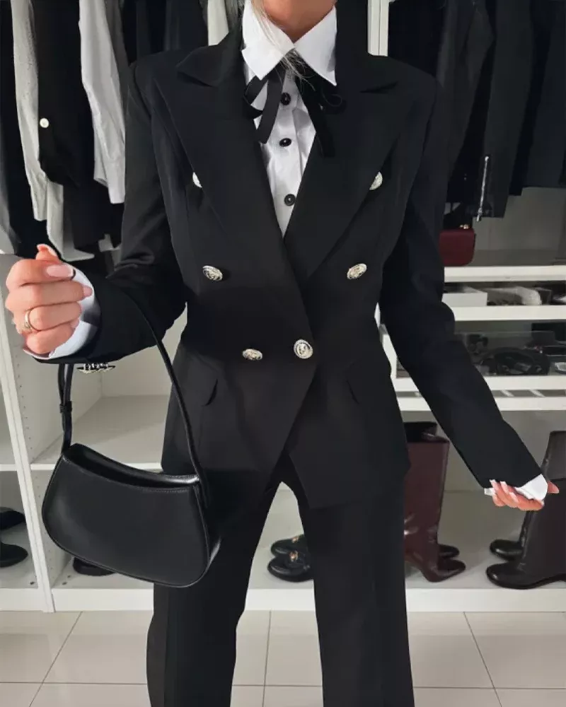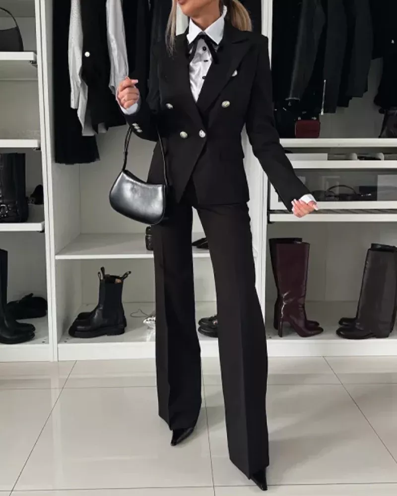 Completo donna elegante composto da blazer doppiopetto e pantalone a palazzo, progettato per valorizzare la silhouette con un equilibrio preciso tra struttura e fluidità. Il taglio sartoriale del blazer definisce le spalle e il punto vita, creando una linea pulita e slanciata che trasmette sicurezza e presenza.