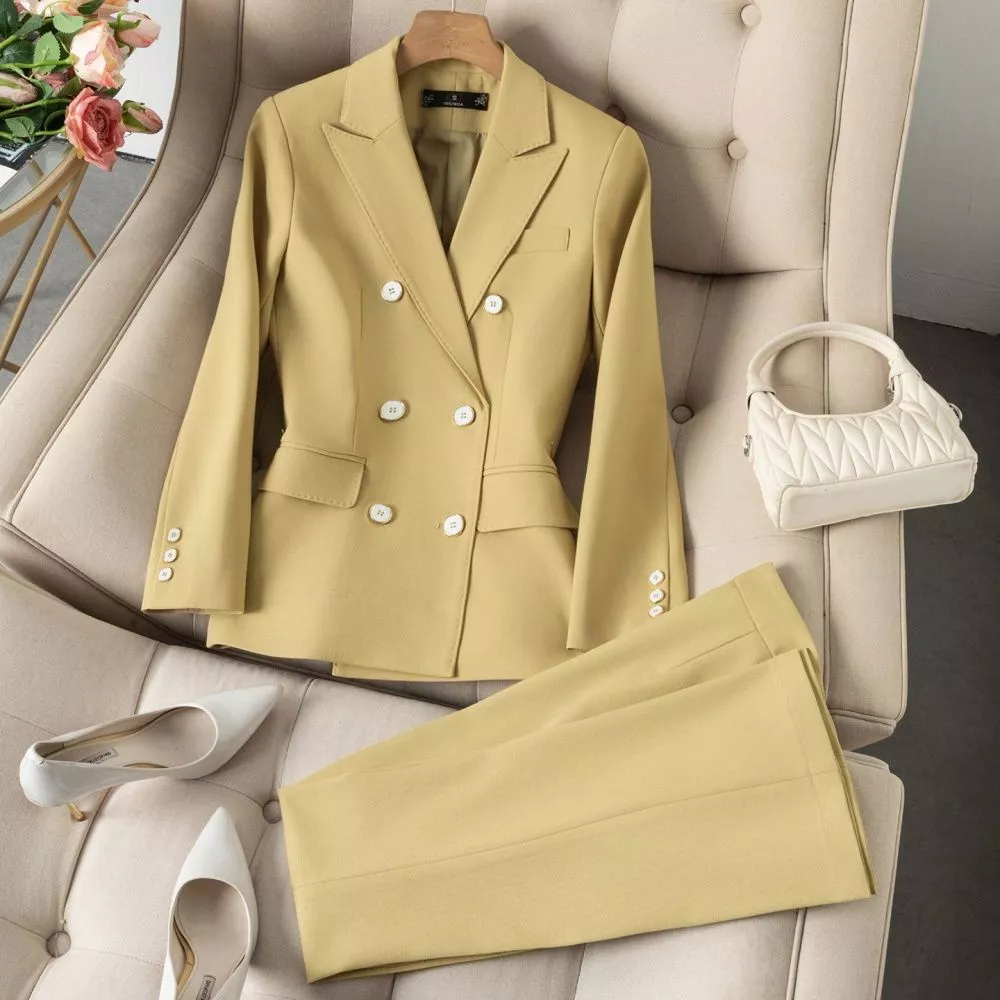 Completo Donna Elegante Senape Tailleur Doppiopetto Giacca Pantalone CF68422