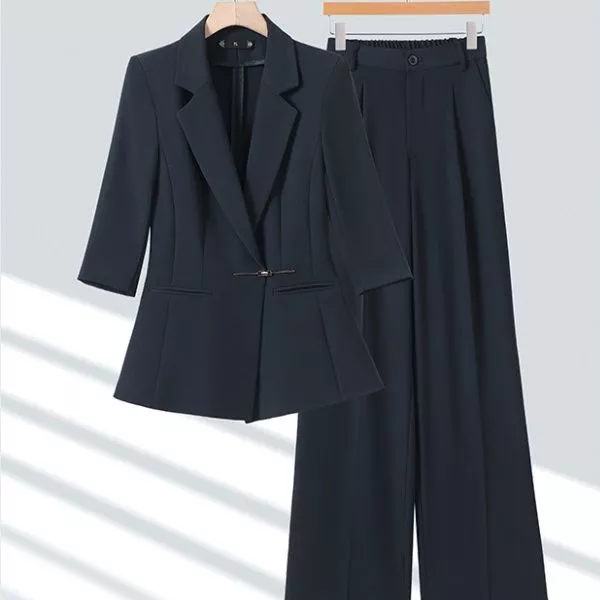 Completo donna elegante composto da giacca e pantalone coordinato perfetto per ufficio, meeting e occasioni formali. La linea pulita e la vestibilità raffinata creano un look professionale moderno e femminile, ideale per outfit business e cerimonia giorno.