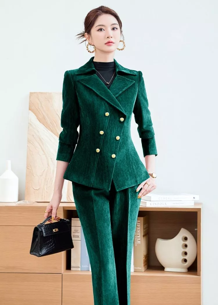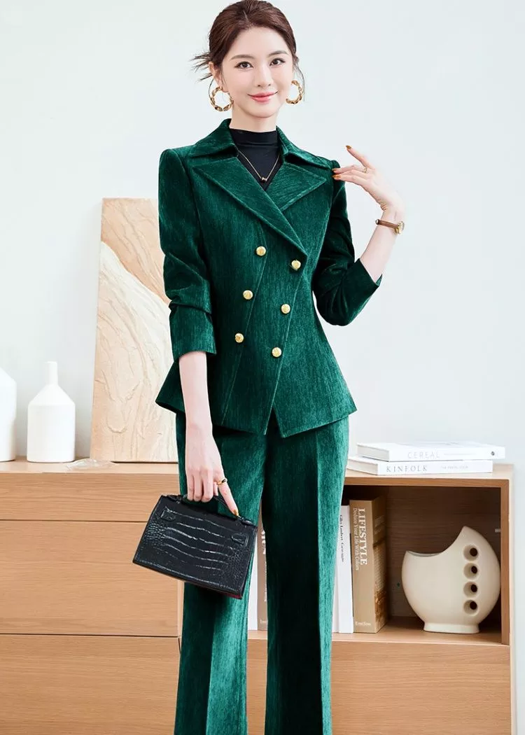 Completo Donna Elegante Verde In Velluto Giacca Doppiopetto E Pantalone CF61345