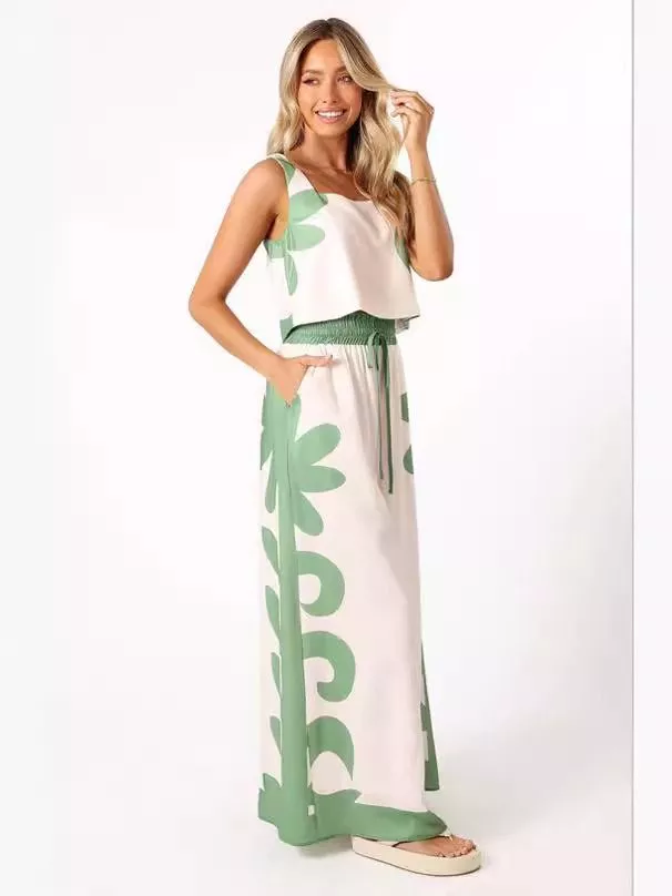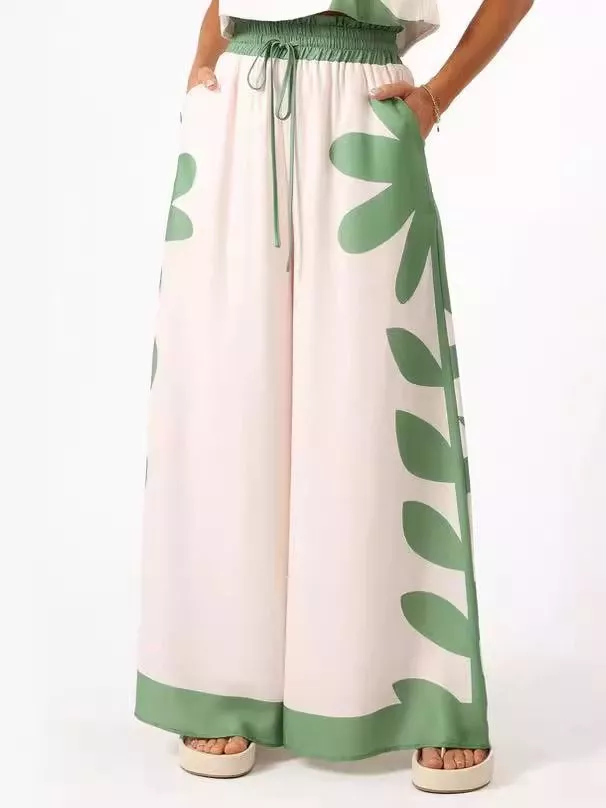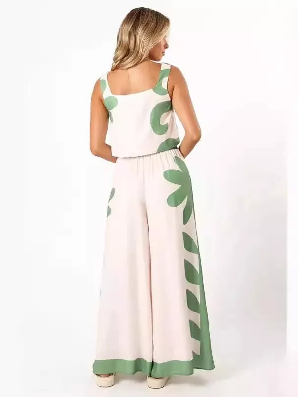 Completo donna estivo composto da top smanicato e pantalone lungo a gamba ampia, caratterizzato da una stampa verde moderna su base chiara. Il design fluido garantisce comfort e libertà di movimento, mentre la vita elasticizzata con coulisse permette una vestibilità regolabile.