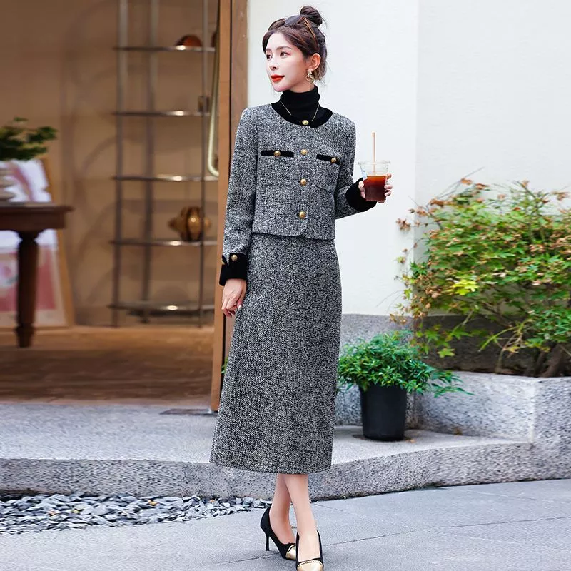 Completo da donna composto da giacca corta coordinata e gonna lunga, pensato per chi cerca un look elegante e strutturato. Il design si distingue per la linea pulita e femminile, con una giacca dal taglio compatto arricchita da bottoni decorativi e una gonna lunga dalla vestibilità dritta che slancia la figura.