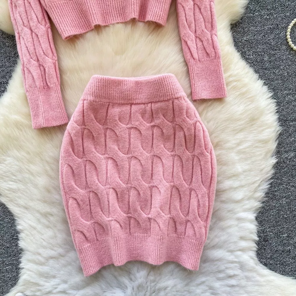 Completo donna due pezzi in maglia composto da top corto a maniche lunghe e gonna coordinata a vita alta, ideale per creare look femminili, eleganti e moderni. La lavorazione a rilievo dona texture e carattere al capo, valorizzando la silhouette con una vestibilità aderente ma confortevole.