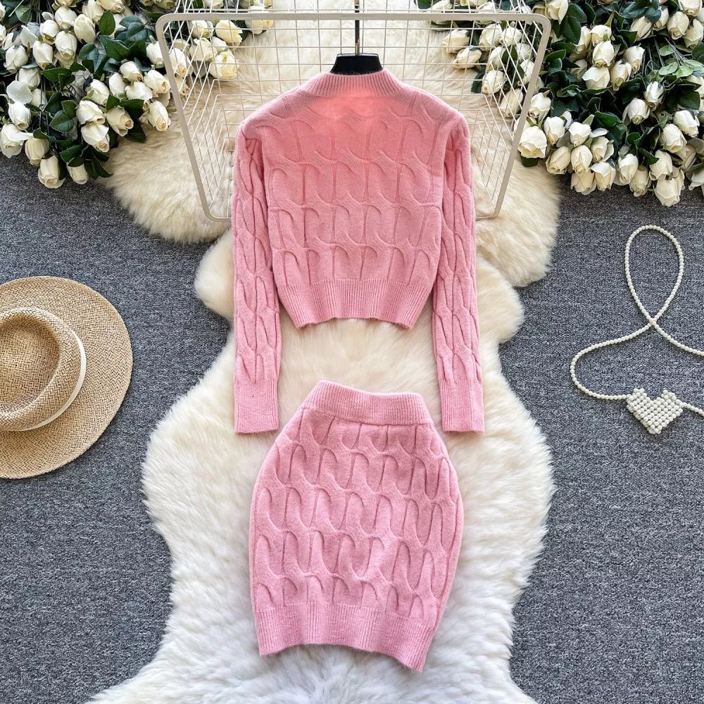 Completo Donna In Maglia Top Corto E Gonna Rosa Elegante Due Pezzi CF65455