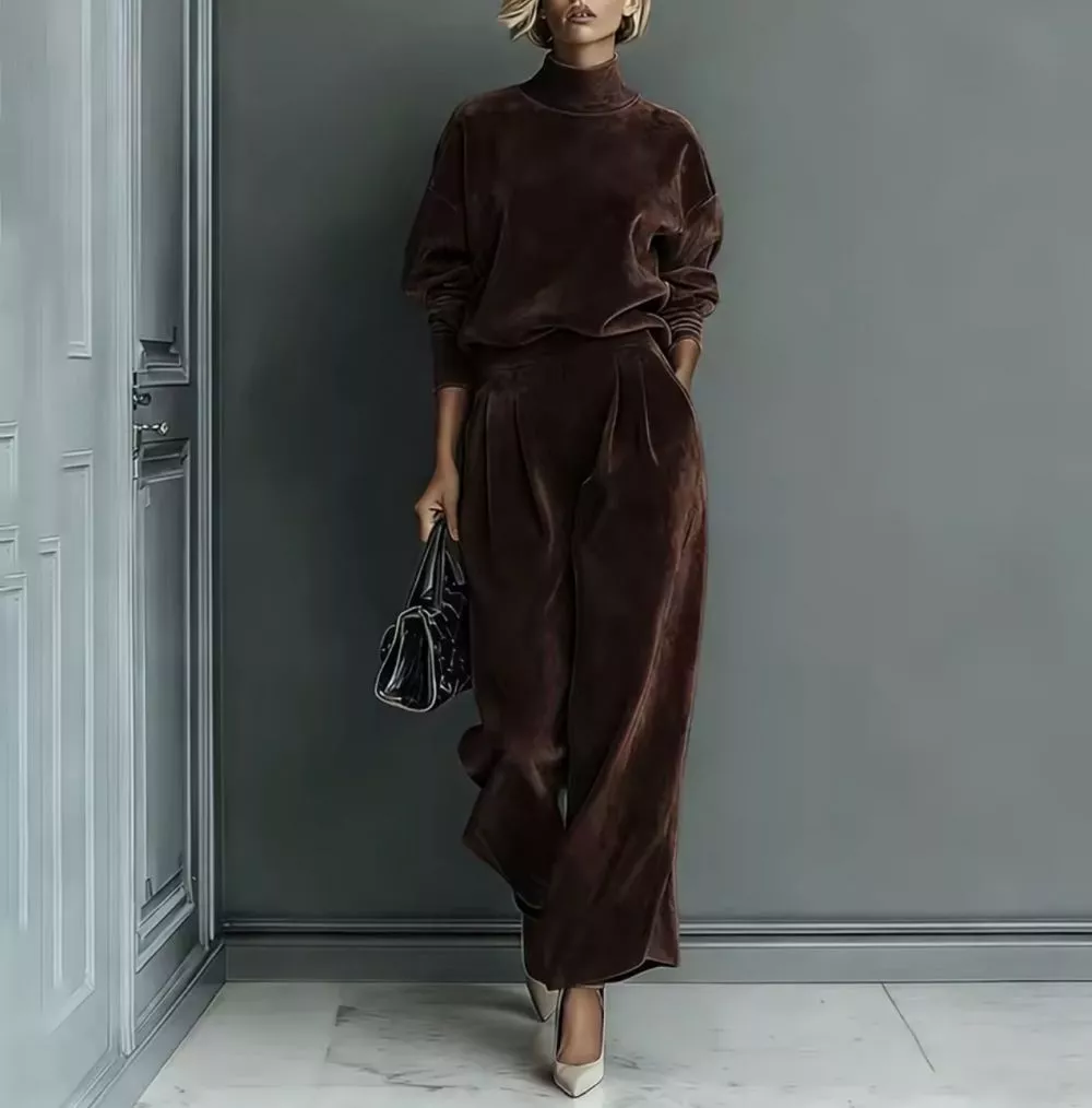 Completo Donna Marrone Effetto Velluto Outfit Elegante Con Pantalone Ampio 63927