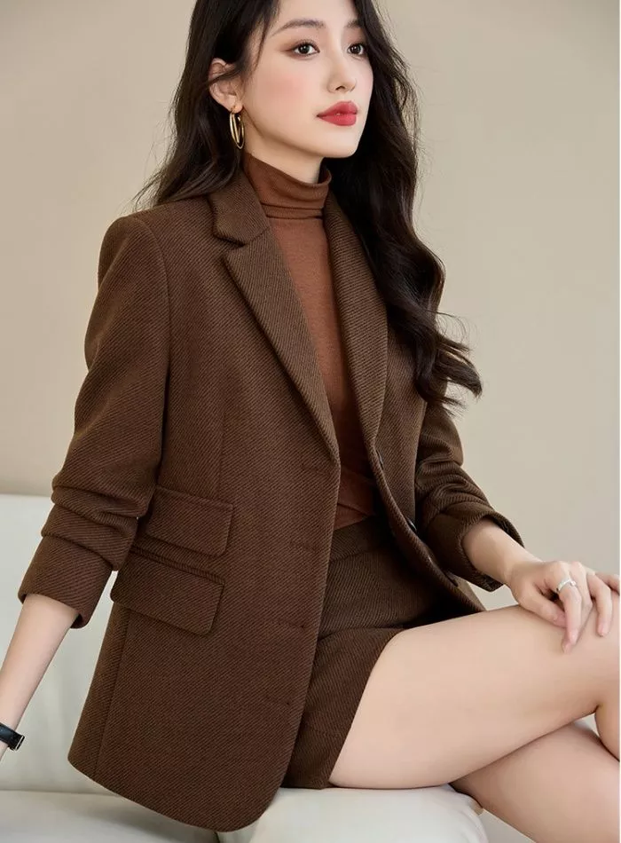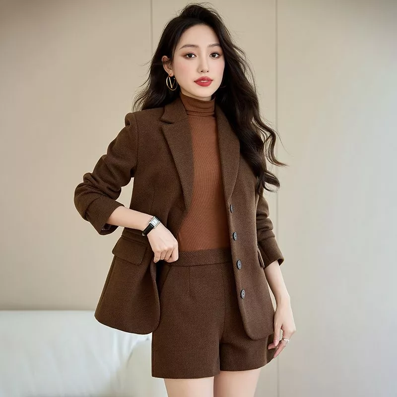 Completo Donna Marrone Giacca Elegante E Shorts Coordinati Stile Chic CF58279