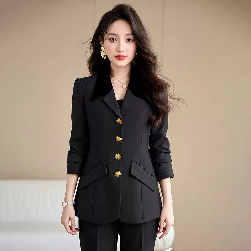 Questo completo donna, composto da giacca strutturata e pantaloni eleganti, è pensato per valorizzare la figura con una linea affusolata e moderna. La giacca presenta un taglio sartoriale con bottoni decorativi dorati e collo nero a contrasto, un dettaglio che rende l'insieme ancora più raffinato. I pantaloni, dritti e slanciati, completano un look ideale per l'ufficio, per gli appuntamenti professionali o per chi desidera uno stile curato e femminile in ogni occasione.