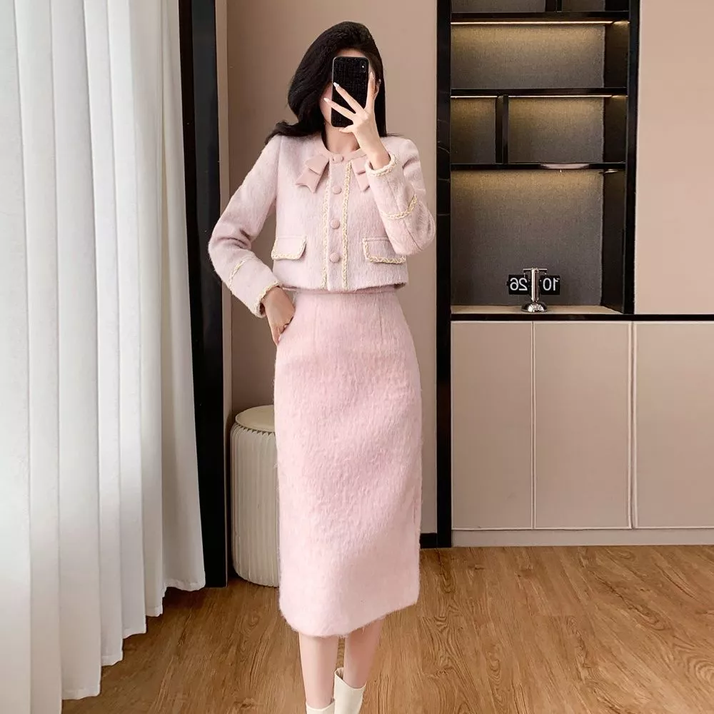 Completo Donna Rosa Giacca Corta E Gonna Lunga Elegante Stile Bon Ton CF64035