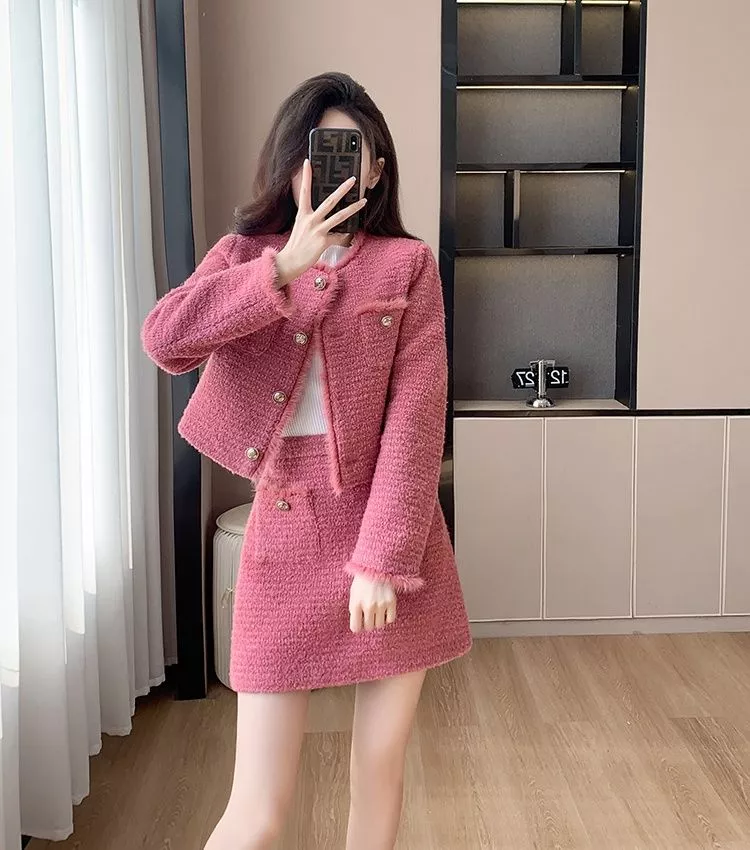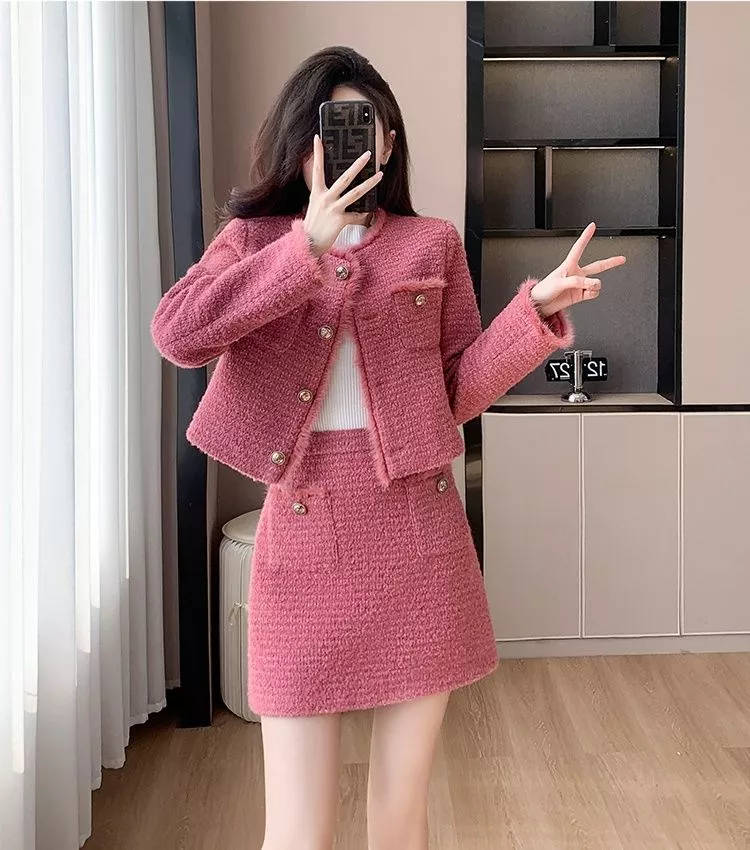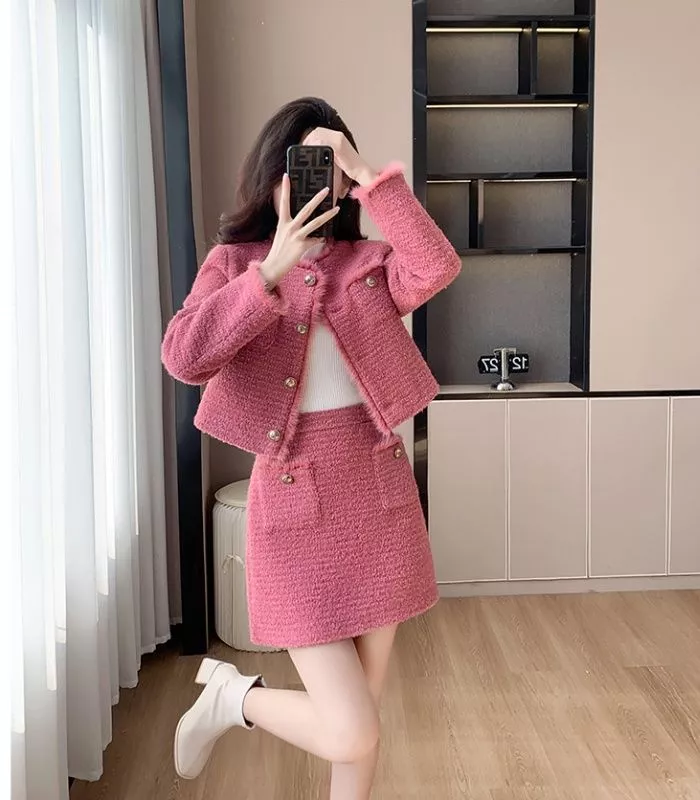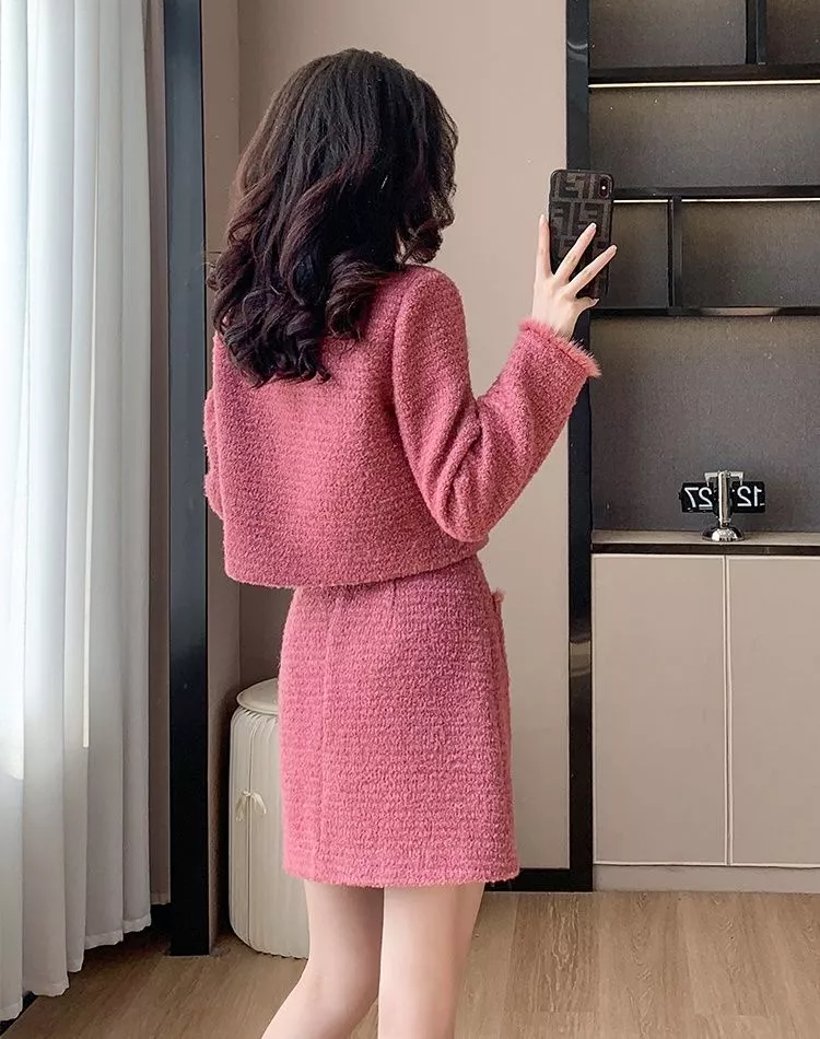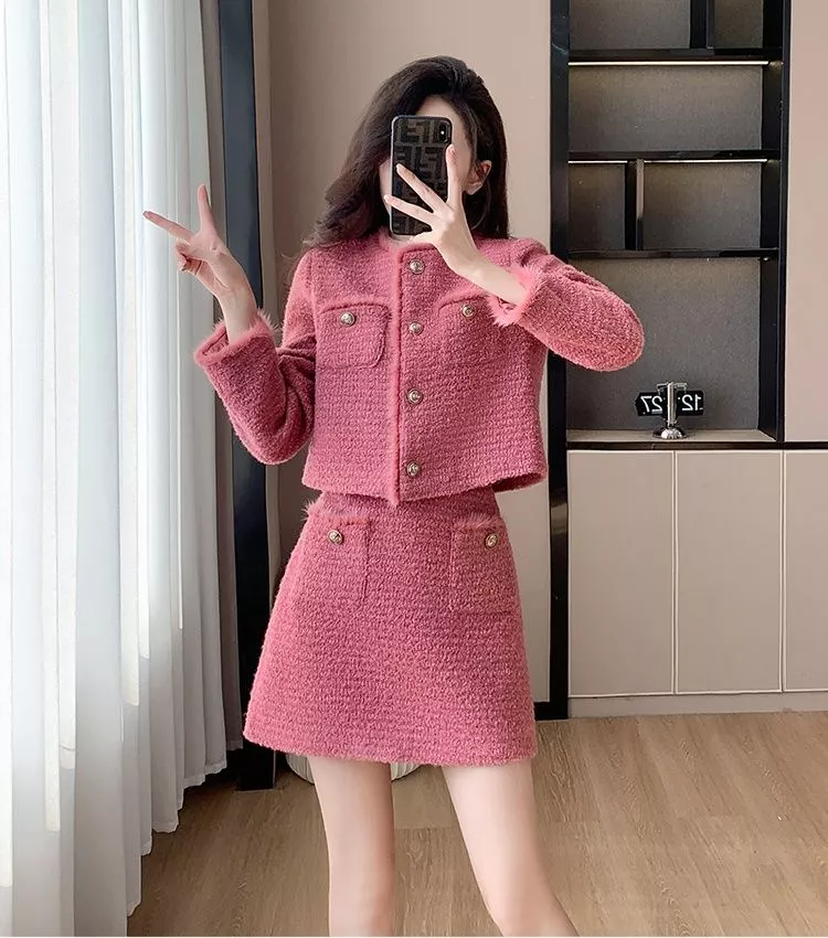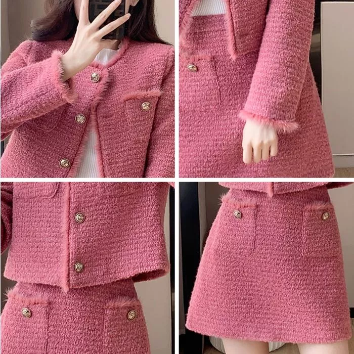Completo elegante e moderno composto da giacca corta e minigonna coordinata in tessuto effetto tweed rosa. La giacca presenta un taglio dritto con bottoni decorativi dorati e leggere finiture pelose sui bordi, mentre la gonna a vita alta slancia la figura con un profilo femminile e strutturato. Il tessuto caldo e piacevole al tatto rende questo set perfetto per la stagione autunnale, ideale per look da giorno raffinati o outfit casual chic con un tocco glamour.