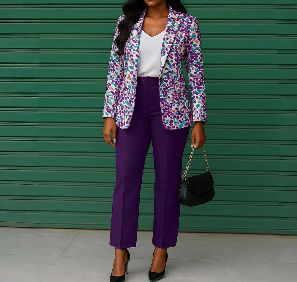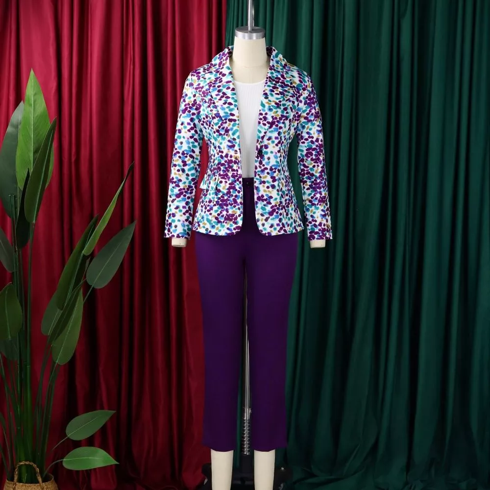 Completo Donna Spezzato Giacca Fantasia Foglie E Pantalone Slim Viola CF63563