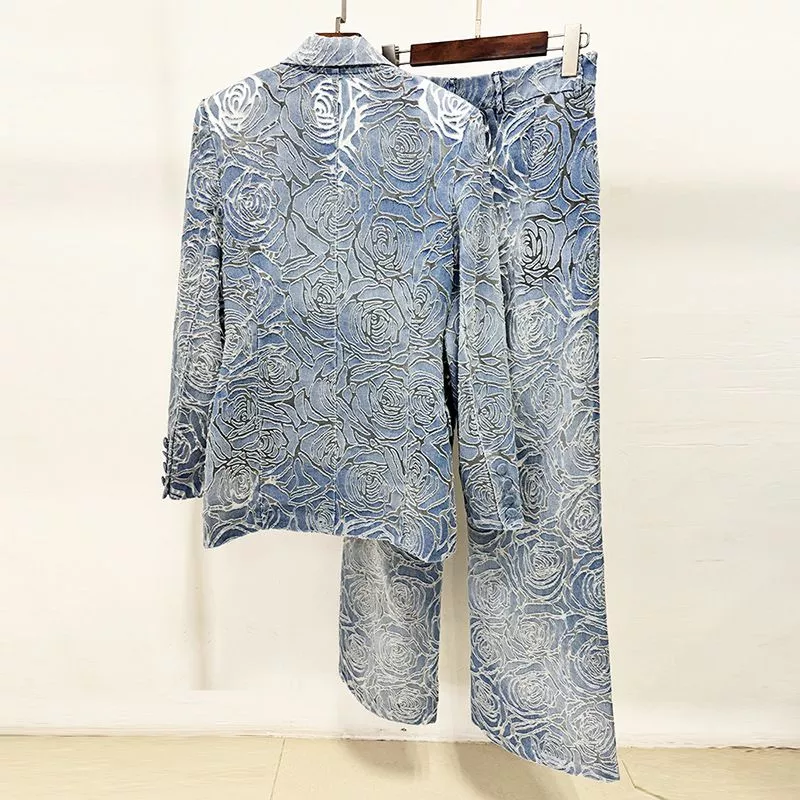 Completo donna elegante composto da giacca doppiopetto strutturata e pantalone coordinato dal taglio ampio. Il tessuto jacquard con motivo floreale a rose crea un effetto tridimensionale raffinato che rende il completo estremamente sofisticato.
