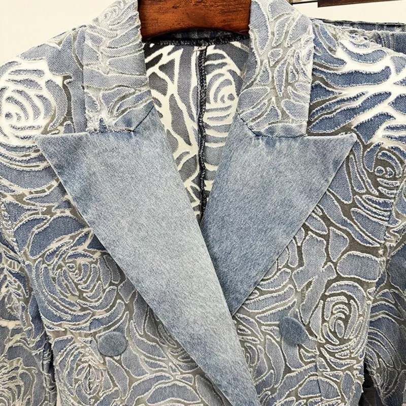 Completo Donna Tailleur Elegante Azzurro Denim Jacquard Giacca Pantalone CF69149