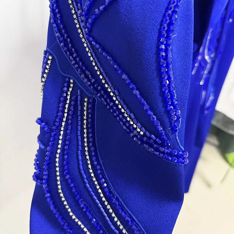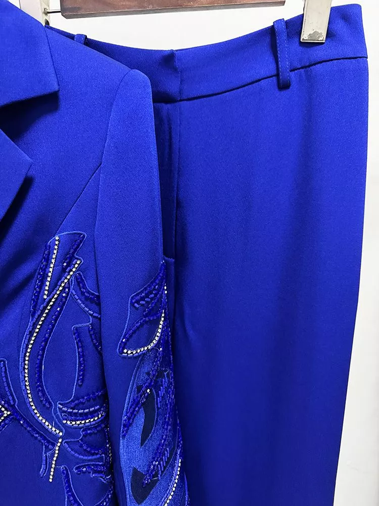 Le applicazioni ricamate con perline e cristalli creano un dettaglio luminoso che rende il completo particolarmente raffinato e scenografico. Il colore blu elettrico intenso aggiunge carattere e modernità, trasformando questo tailleur in un capo di forte personalità.