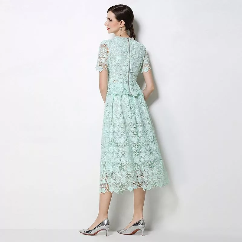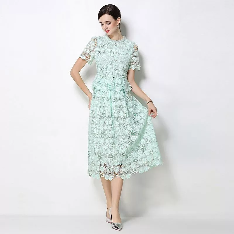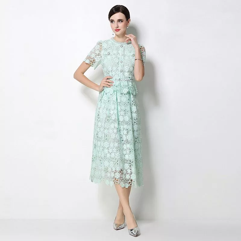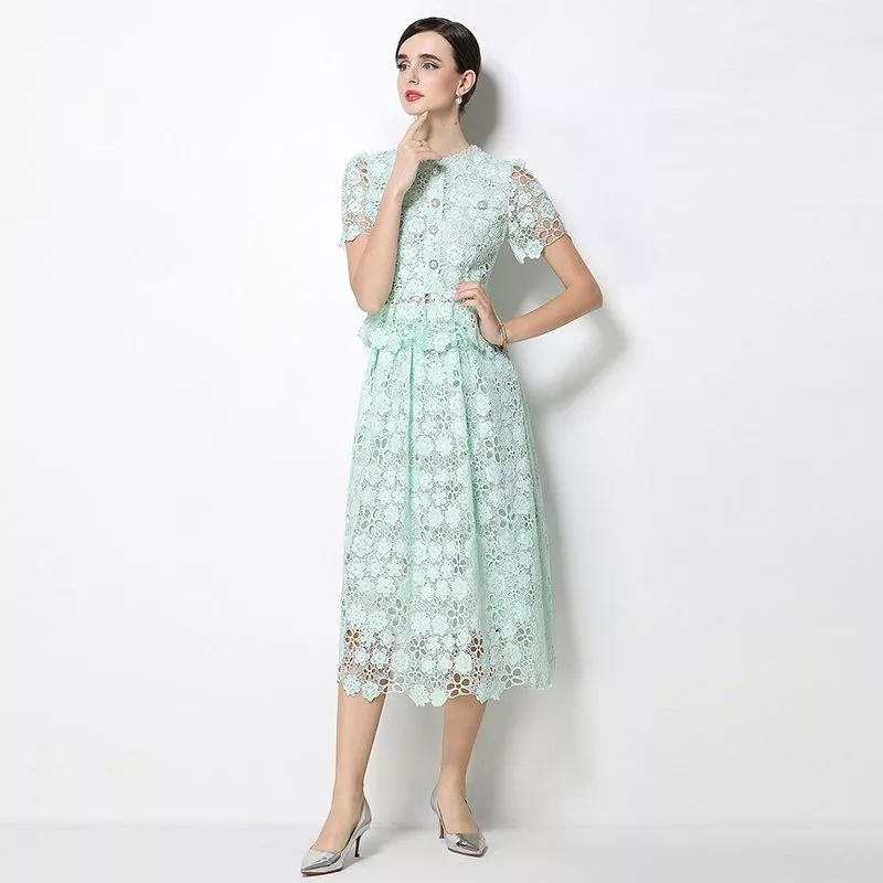 Completo da donna composto da camicia e gonna in pizzo verde menta con lavorazione floreale traforata, ideale per cerimonie ed eventi eleganti. Il set due pezzi unisce raffinatezza e versatilità, permettendo di indossare i capi insieme o separatamente.